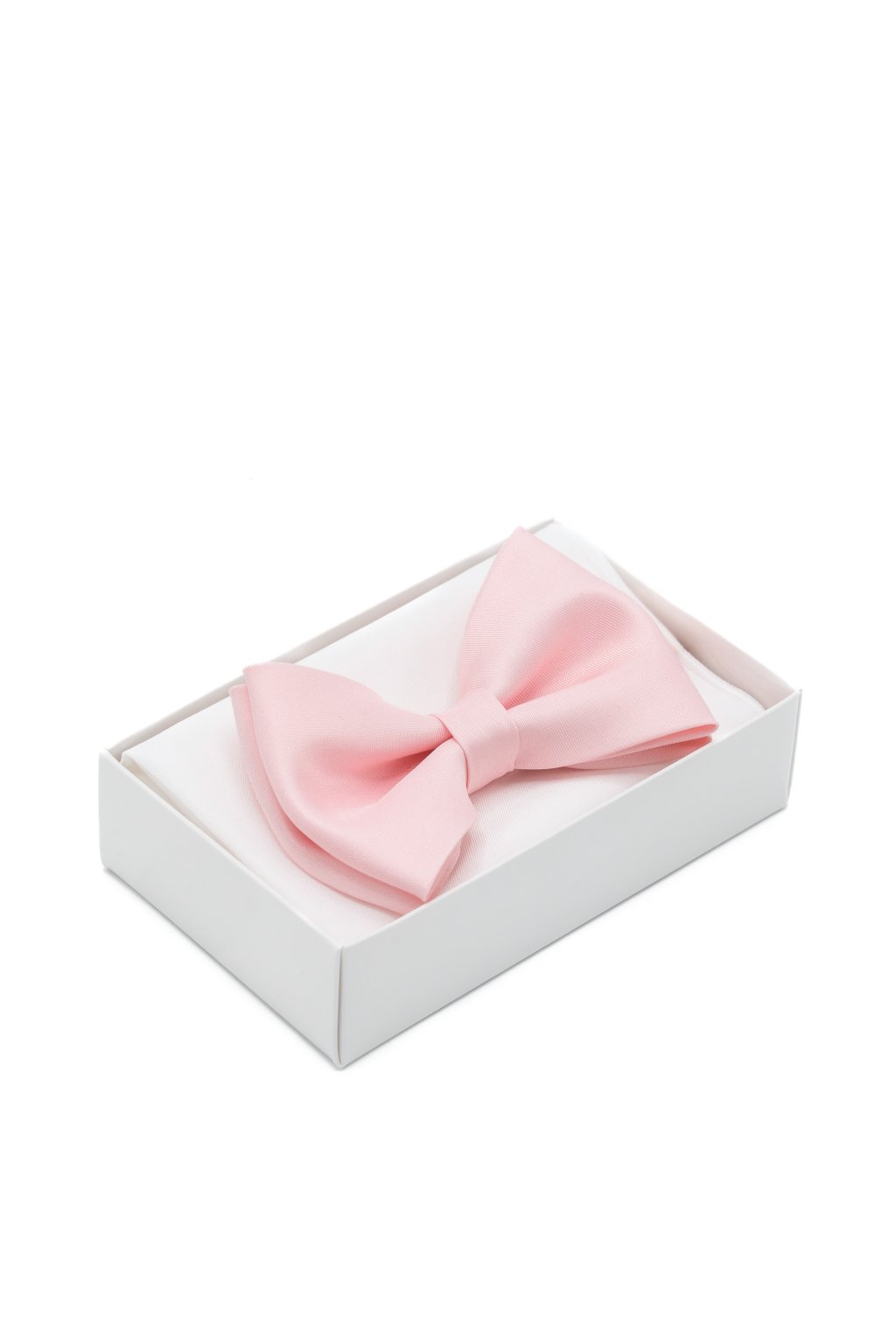 Růžový hladký saténový motýlek a bílý kapesníček v jednom. Motýlek má jednoduché zapínání na háček.