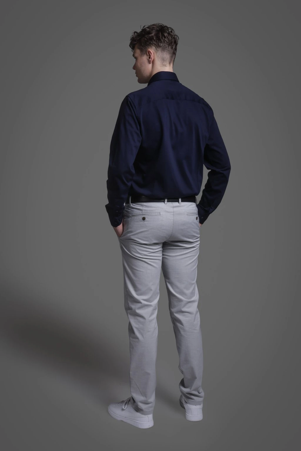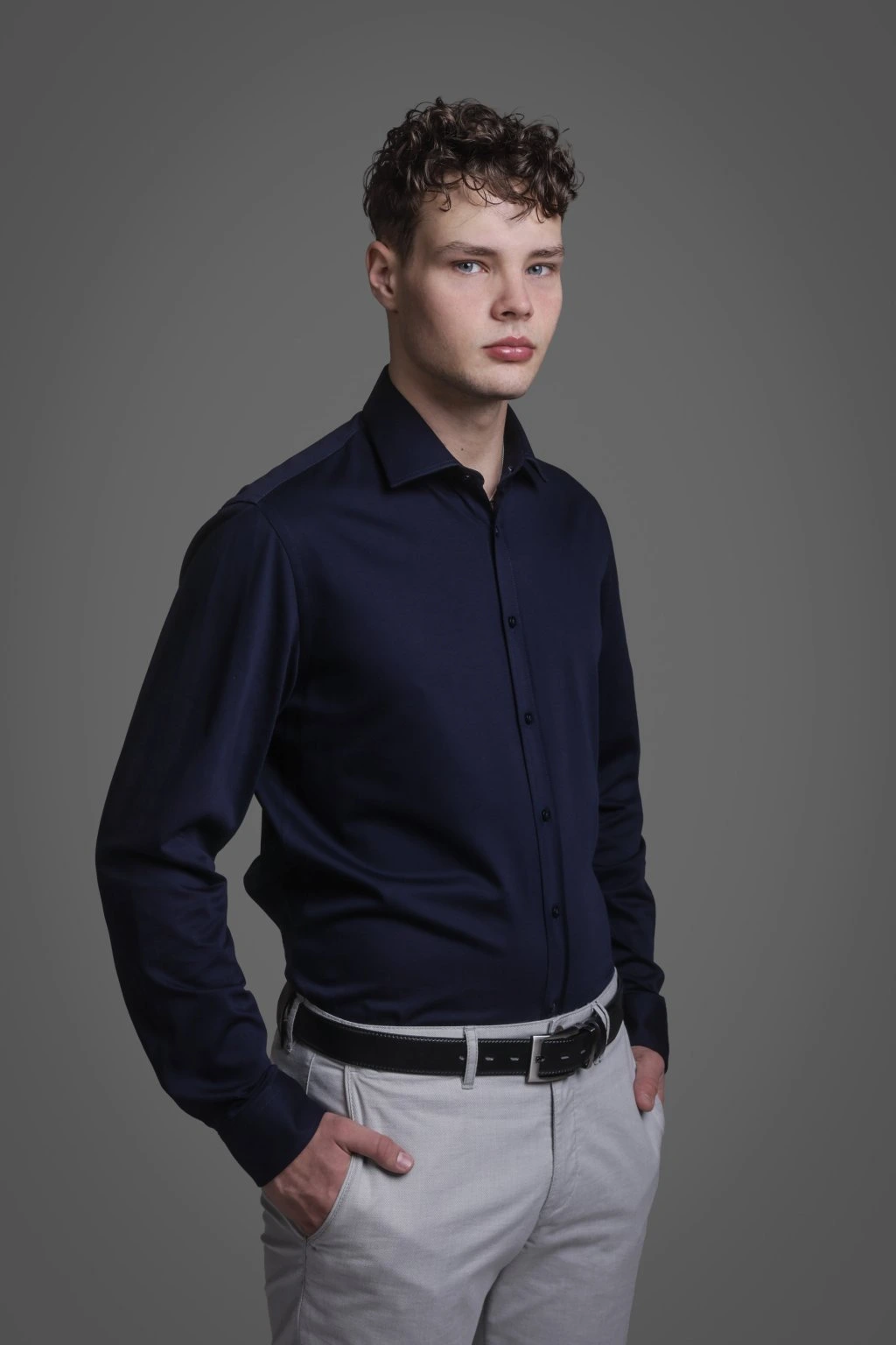 Tmavě modrá bavlněná košile, která je velmi pružná a je tak ideální volbou pokud se chcete cítit komfortně. Košili můžete kombinovat s jakýmikoliv kalhotami, nebo si ji můžete obléci ke společenskému obleku.
