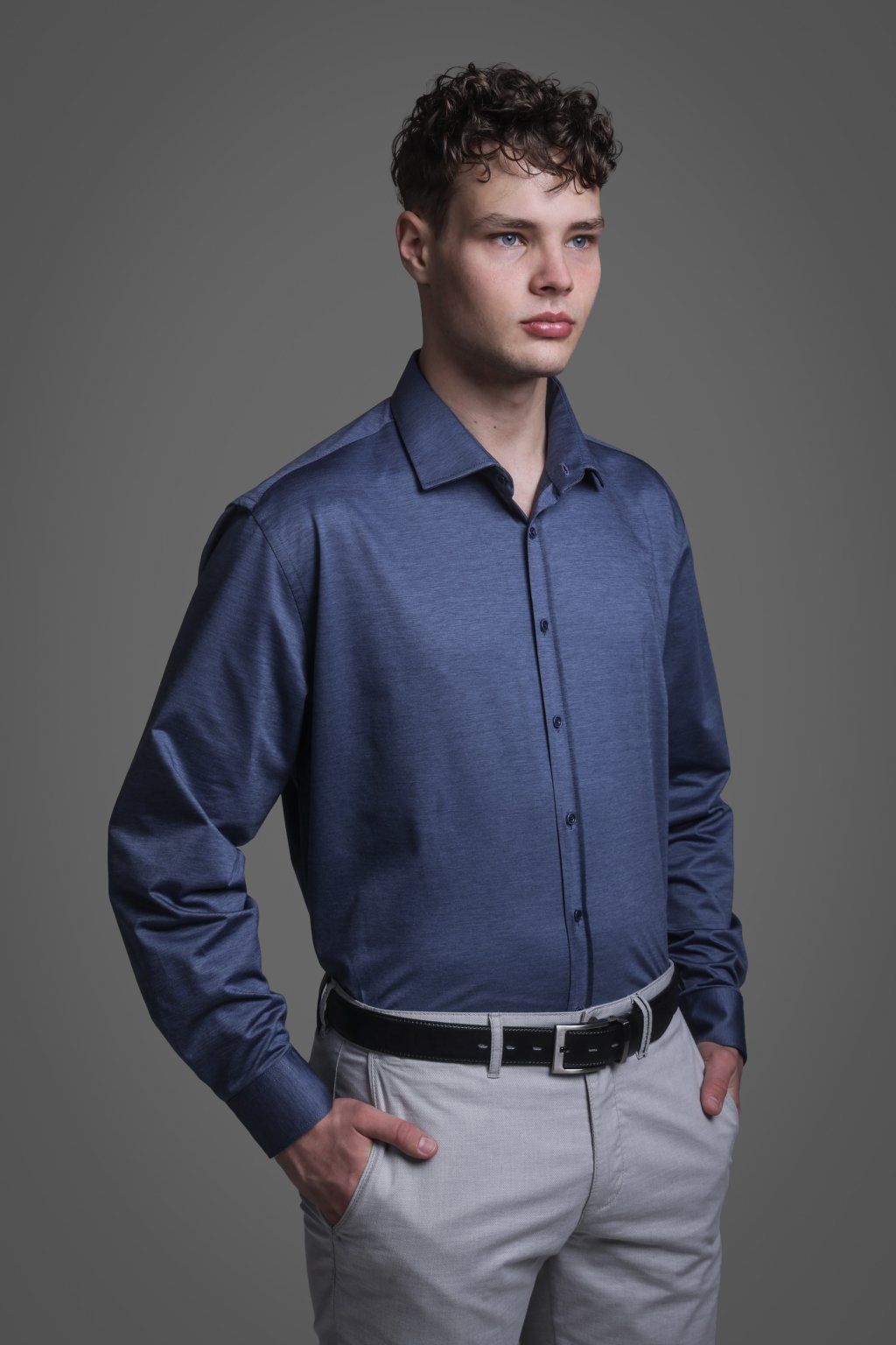 Modrá bavlněná košile v rovném střihu, která je velmi pružná a je tak ideální volbou pokud se chcete cítit komfortně. Košili můžete kombinovat s jakýmikoliv kalhotami, nebo si ji můžete obléci ke společenskému obleku.