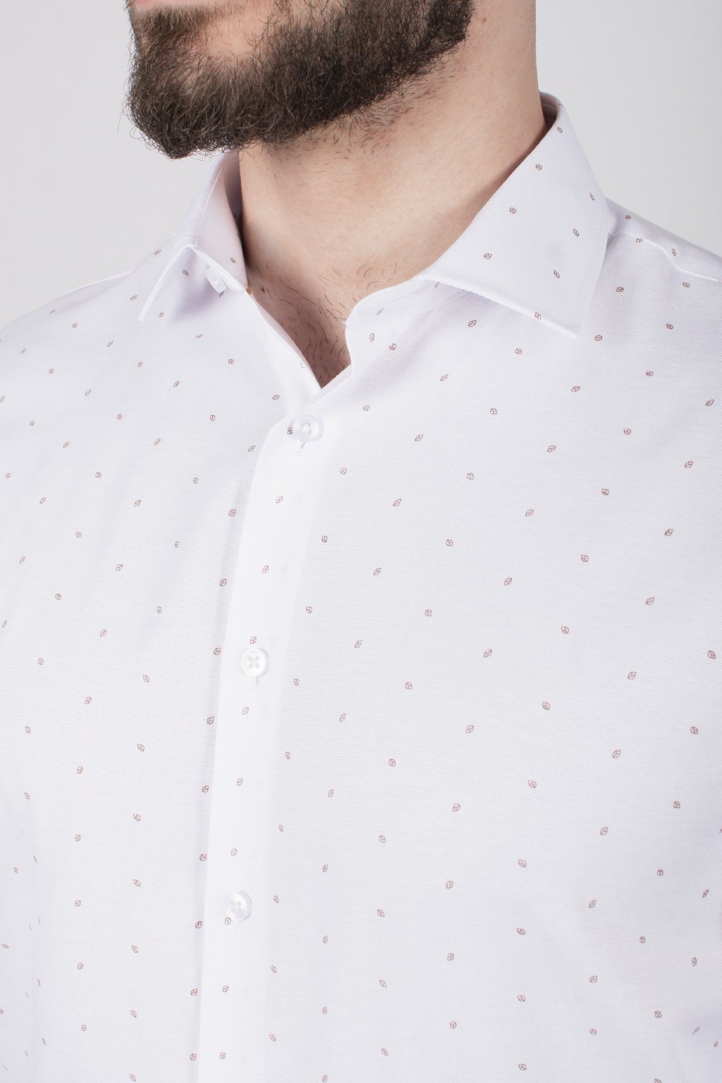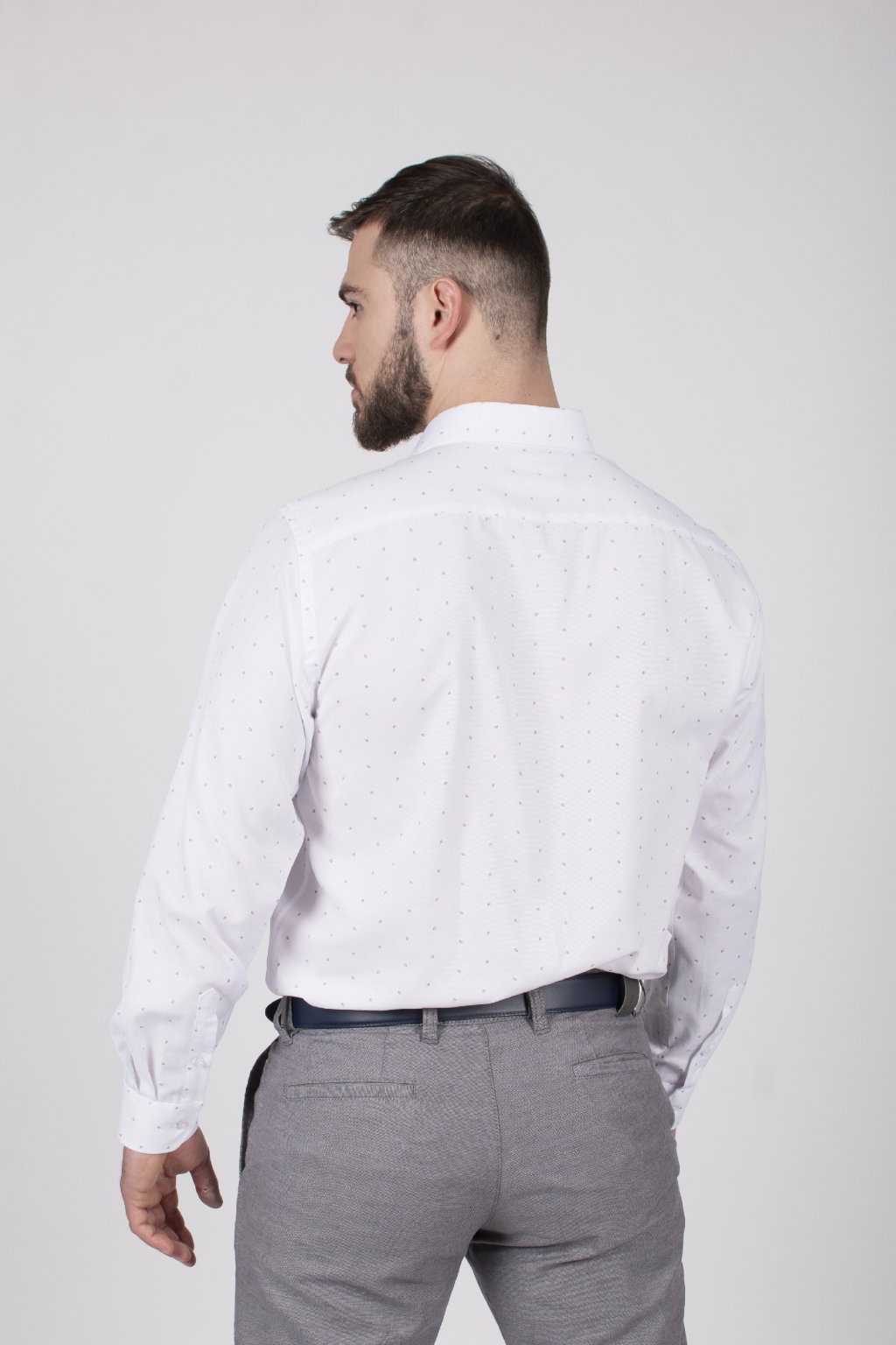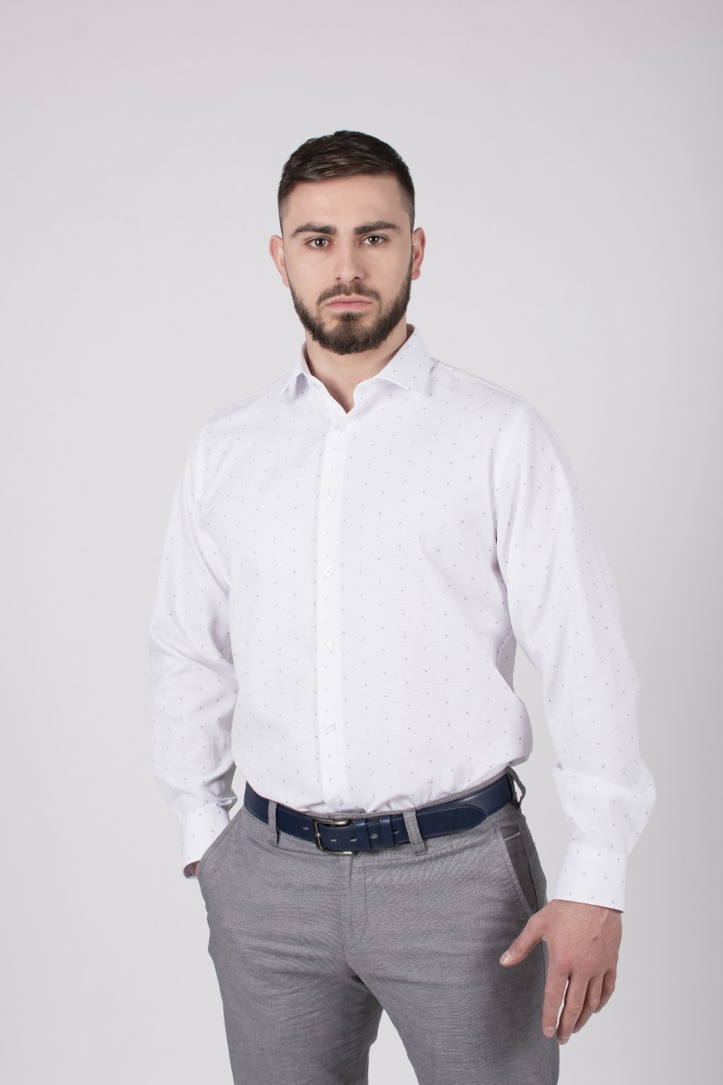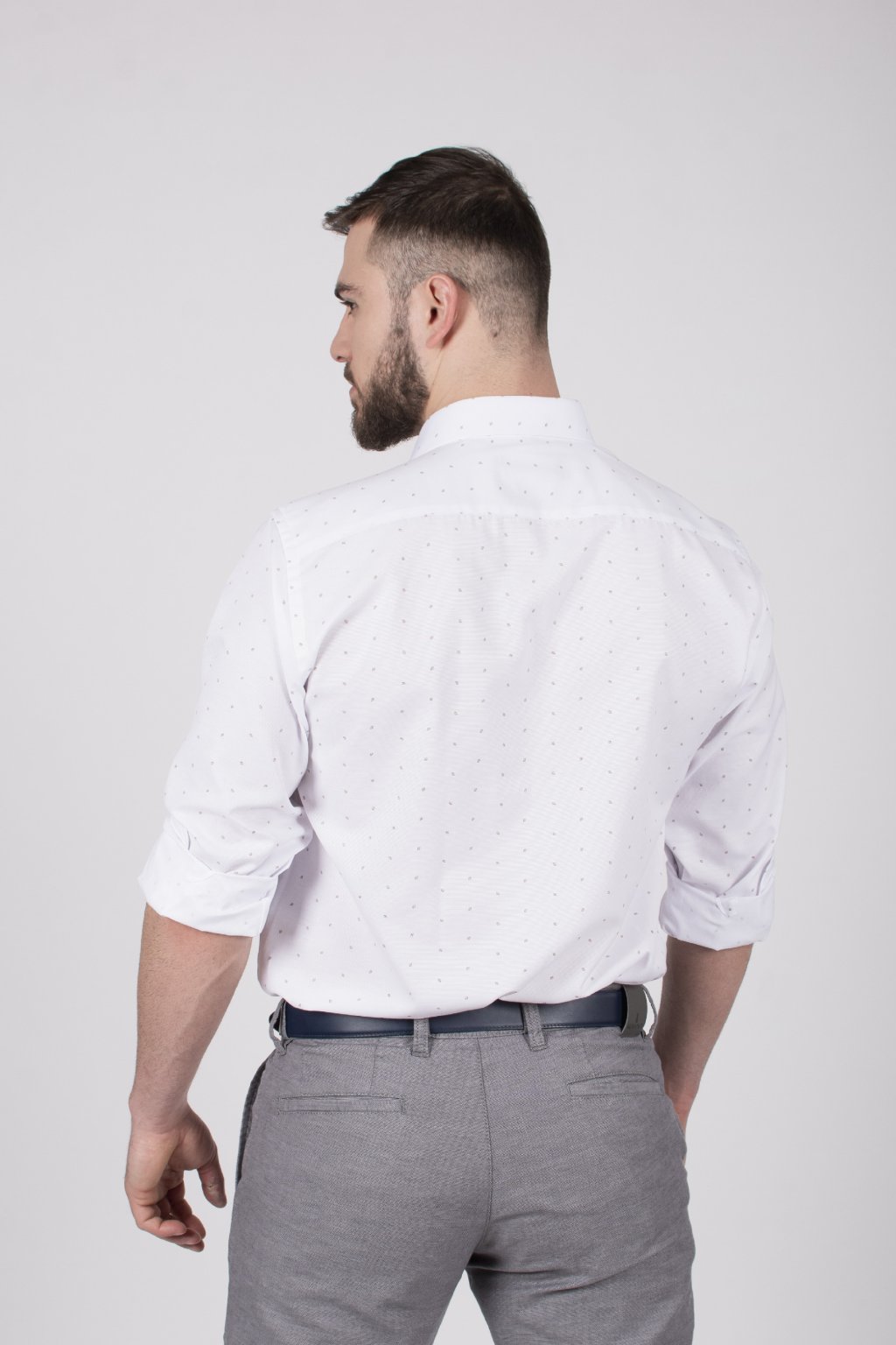 Pánská bílá košile s jemným vzorem ve volnějším střihu. Pánská košile je velice příjemná na nošení a hodí se do obleku, ke klasickým i chinos kalhotám.