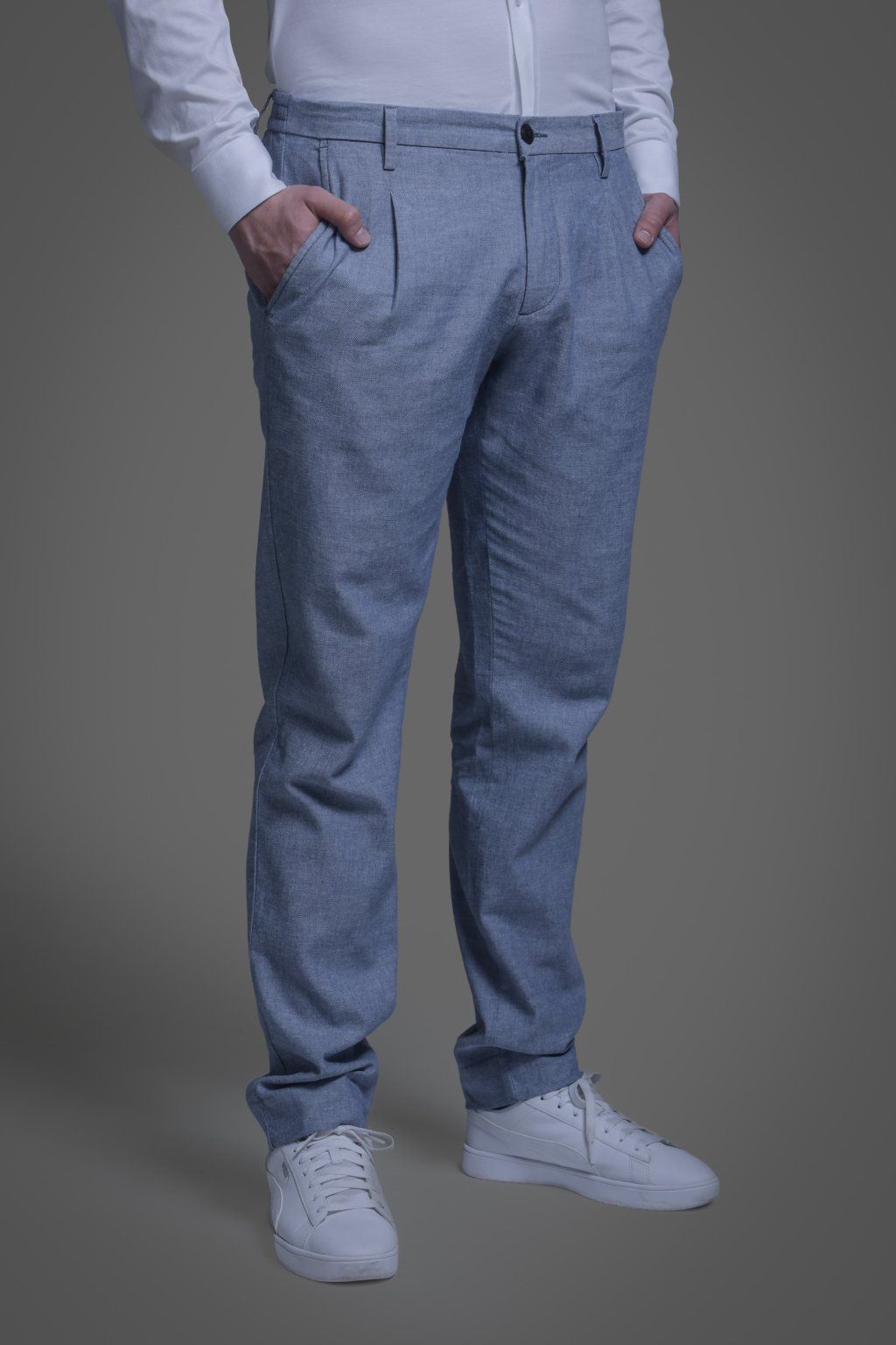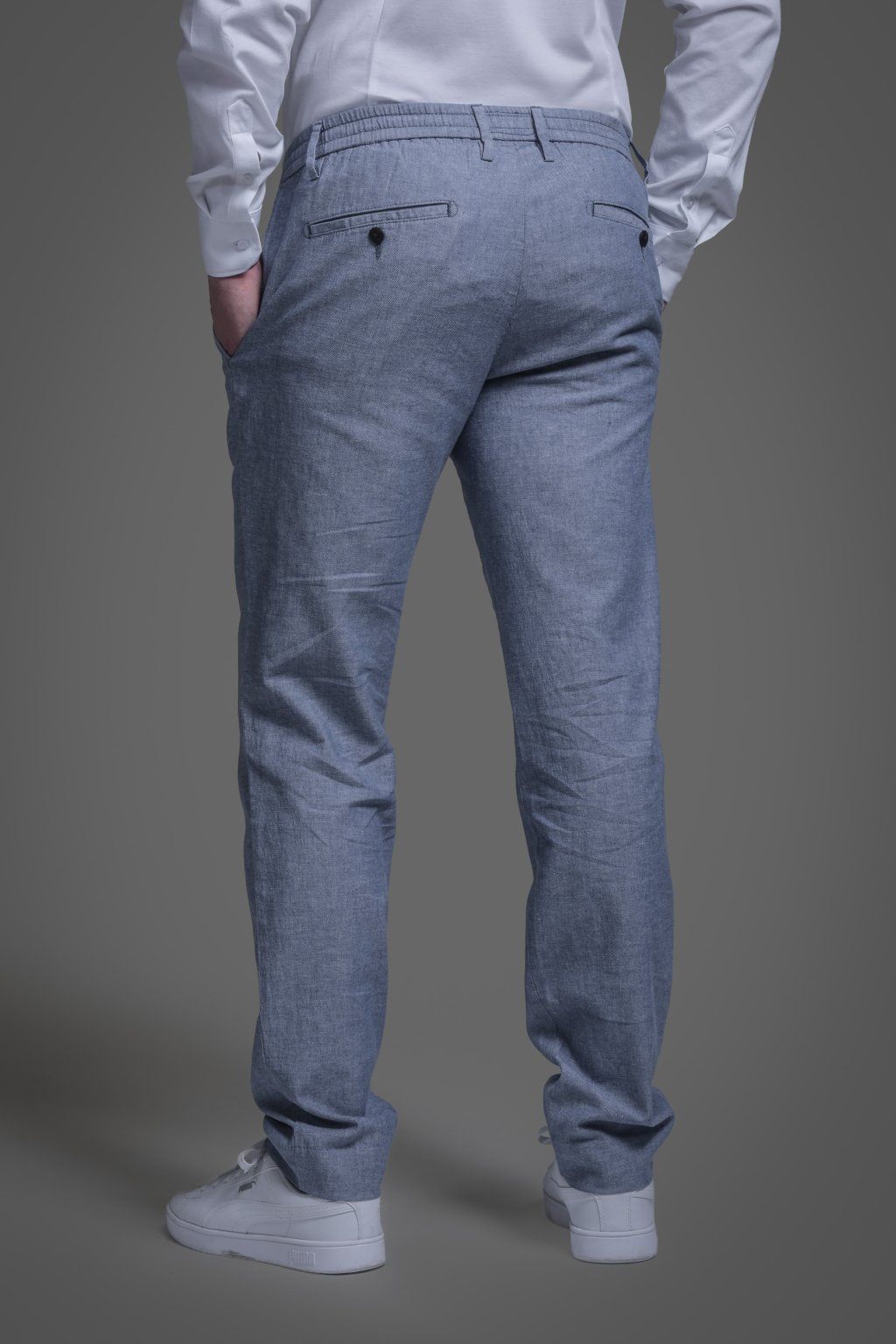 Volnočasové bavlněné kalhoty s podílem lnu v modré barvě. Mají klínové kapsy na předním díle a výpustkové kapsy na zadním díle. Díky podílu lnu jsou lehké, prodyšné a velmi pohodlné, ideální pro letní dny. Skvěle se hodí do práce i pro volný čas.