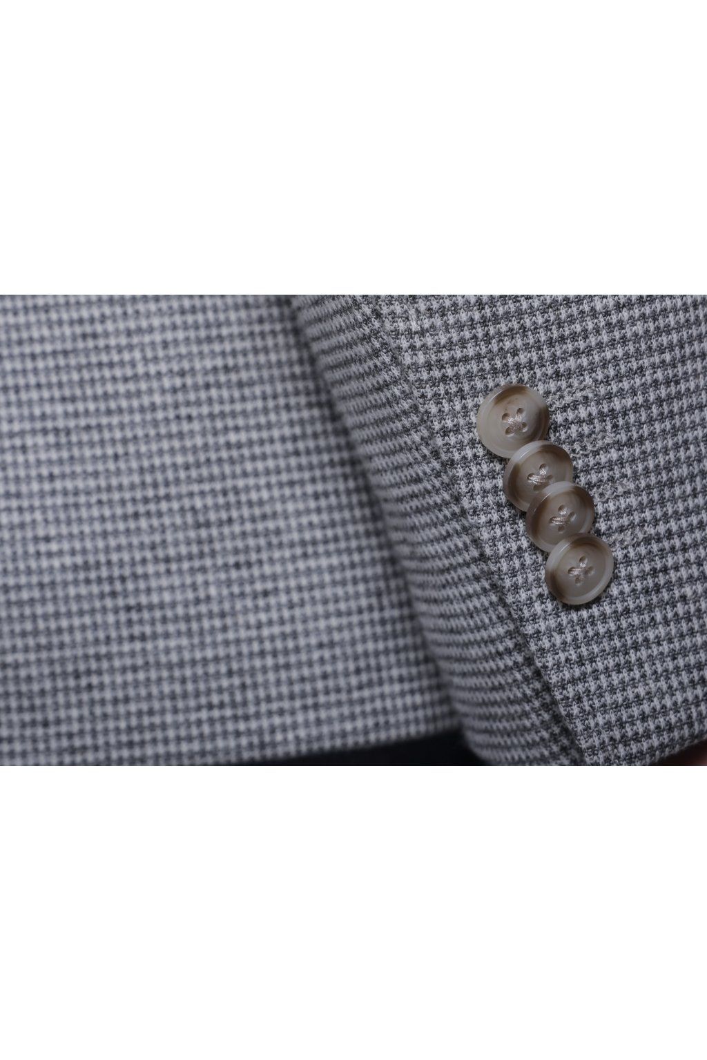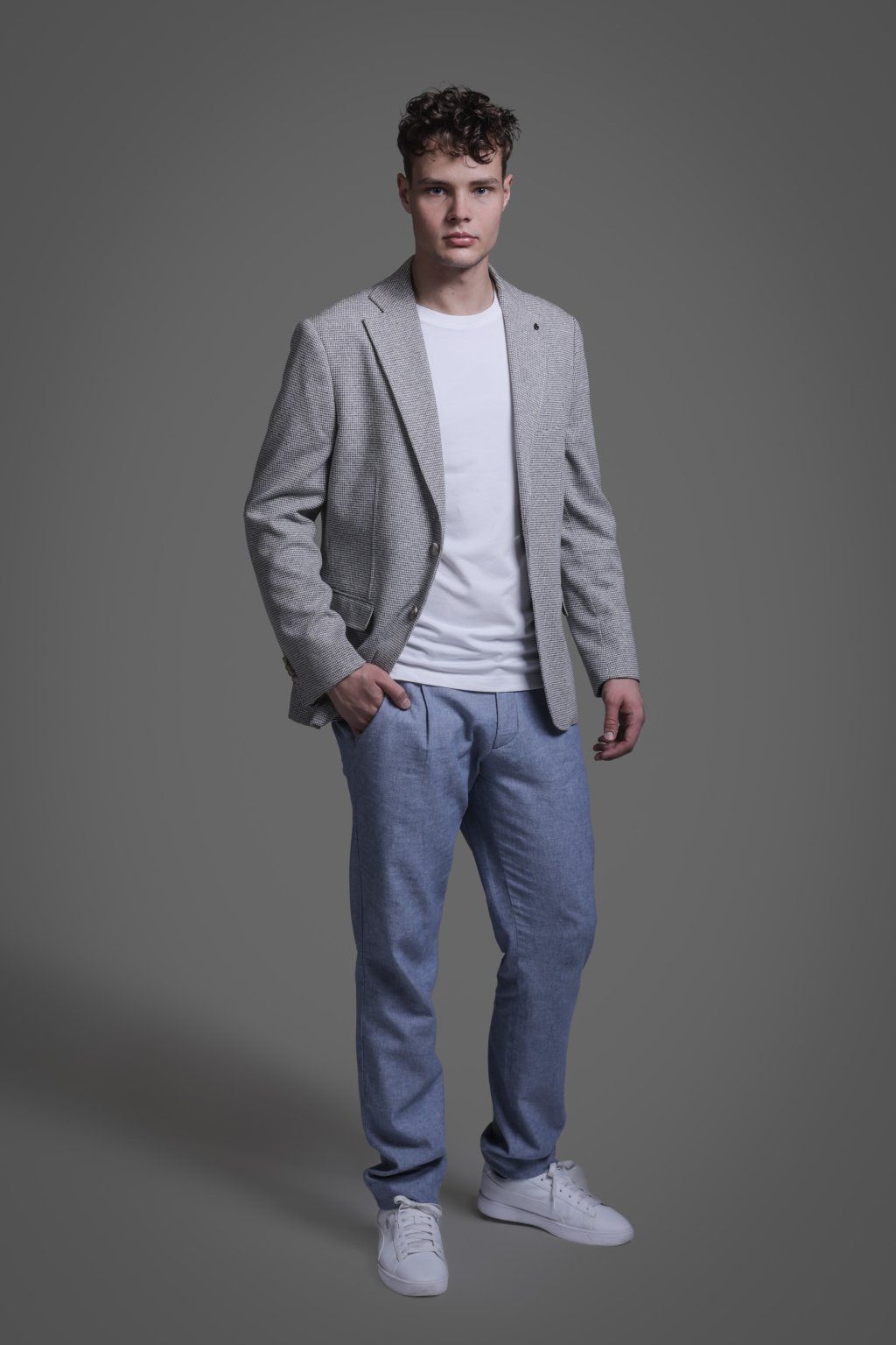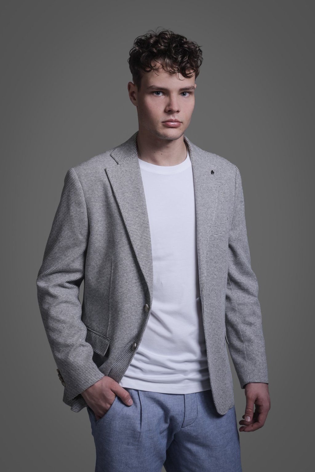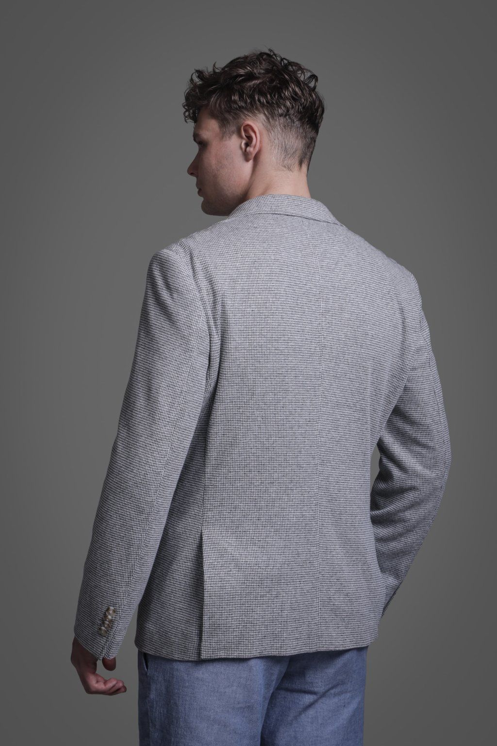 Jarní bavlněné sako v šedé barvě s kapsami. Má dva knoflíky, dva praktické rozparky a je ušito ve volnějším střihu, který je velmi příjemný při nošení.