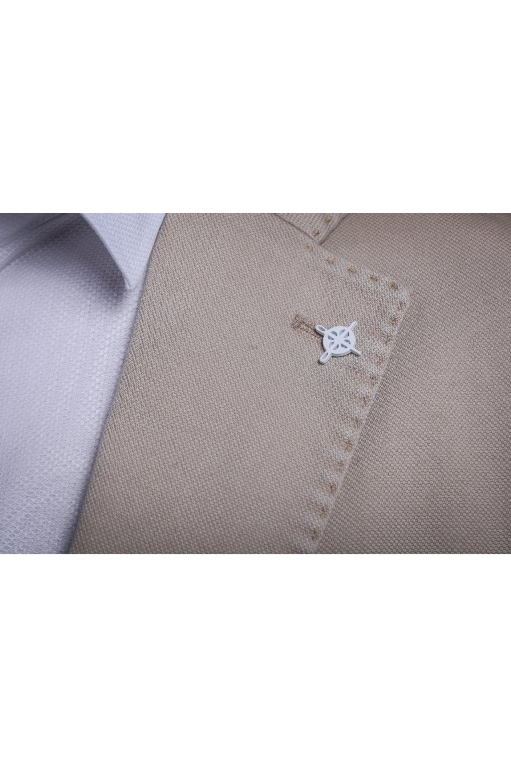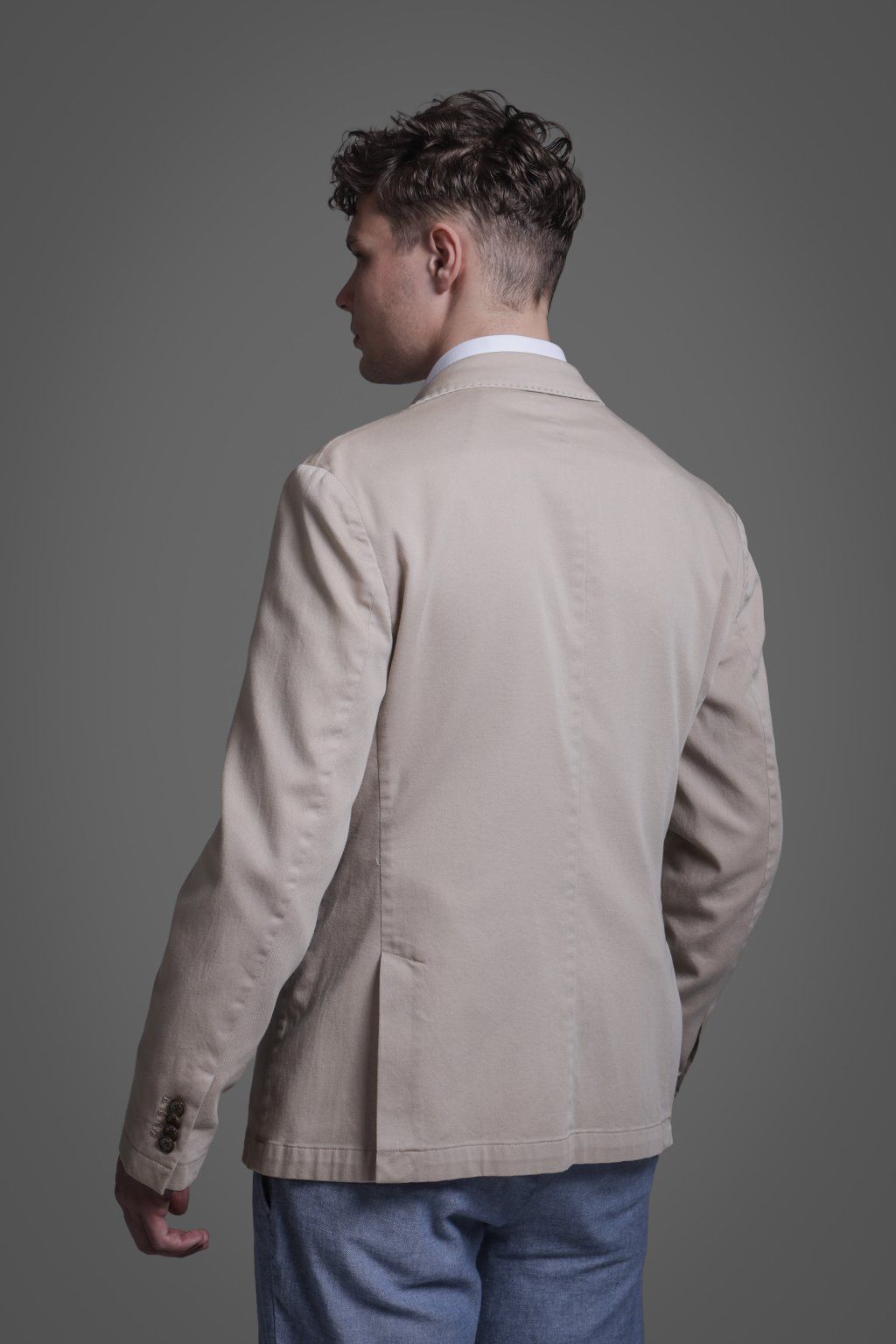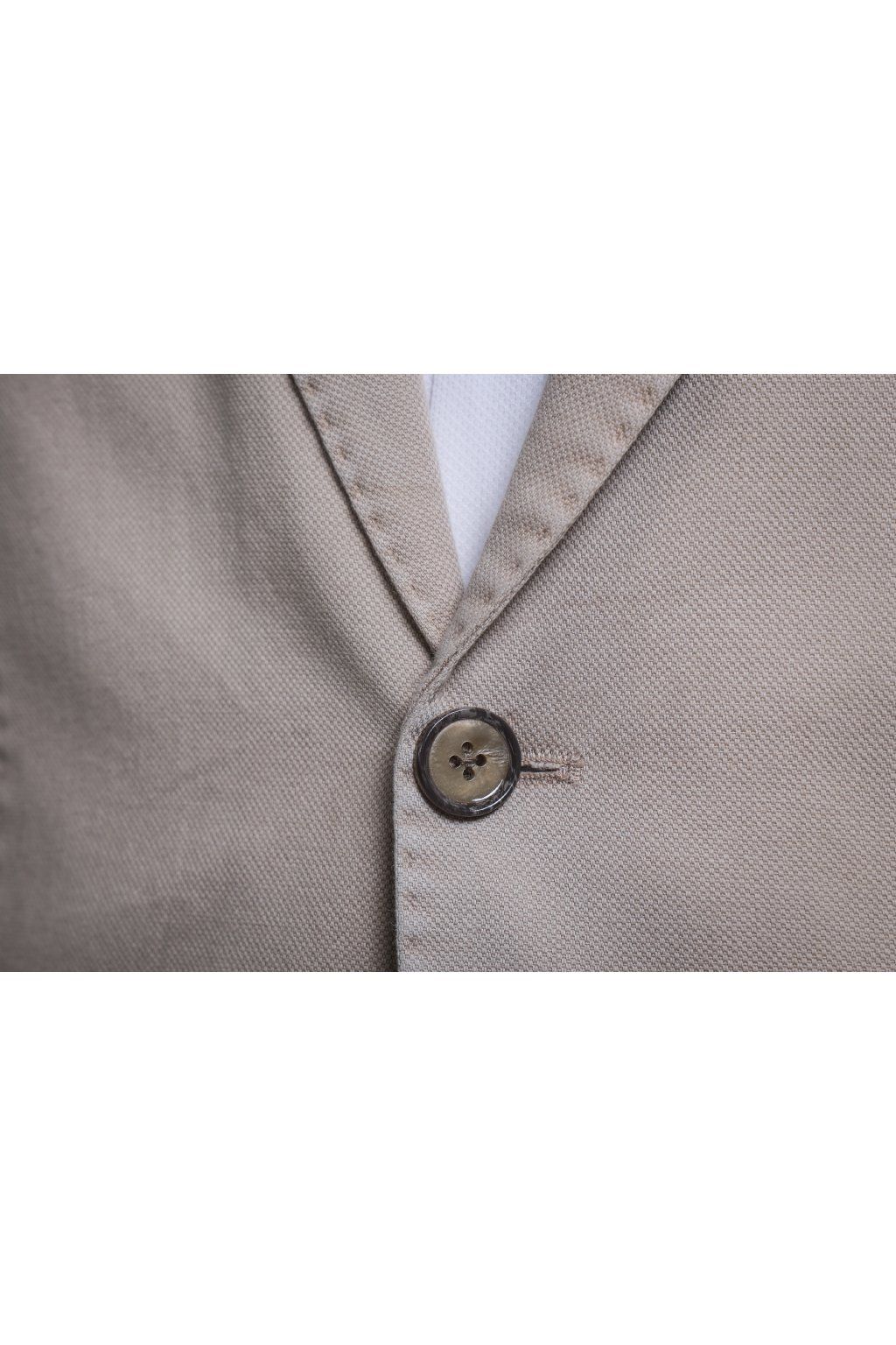 Jarní bavlněné sako v béžové barvě s kapsami. Má dva knoflíky, dva praktické rozparky a je ušito ve volnějším střihu, který je velmi příjemný při nošení.