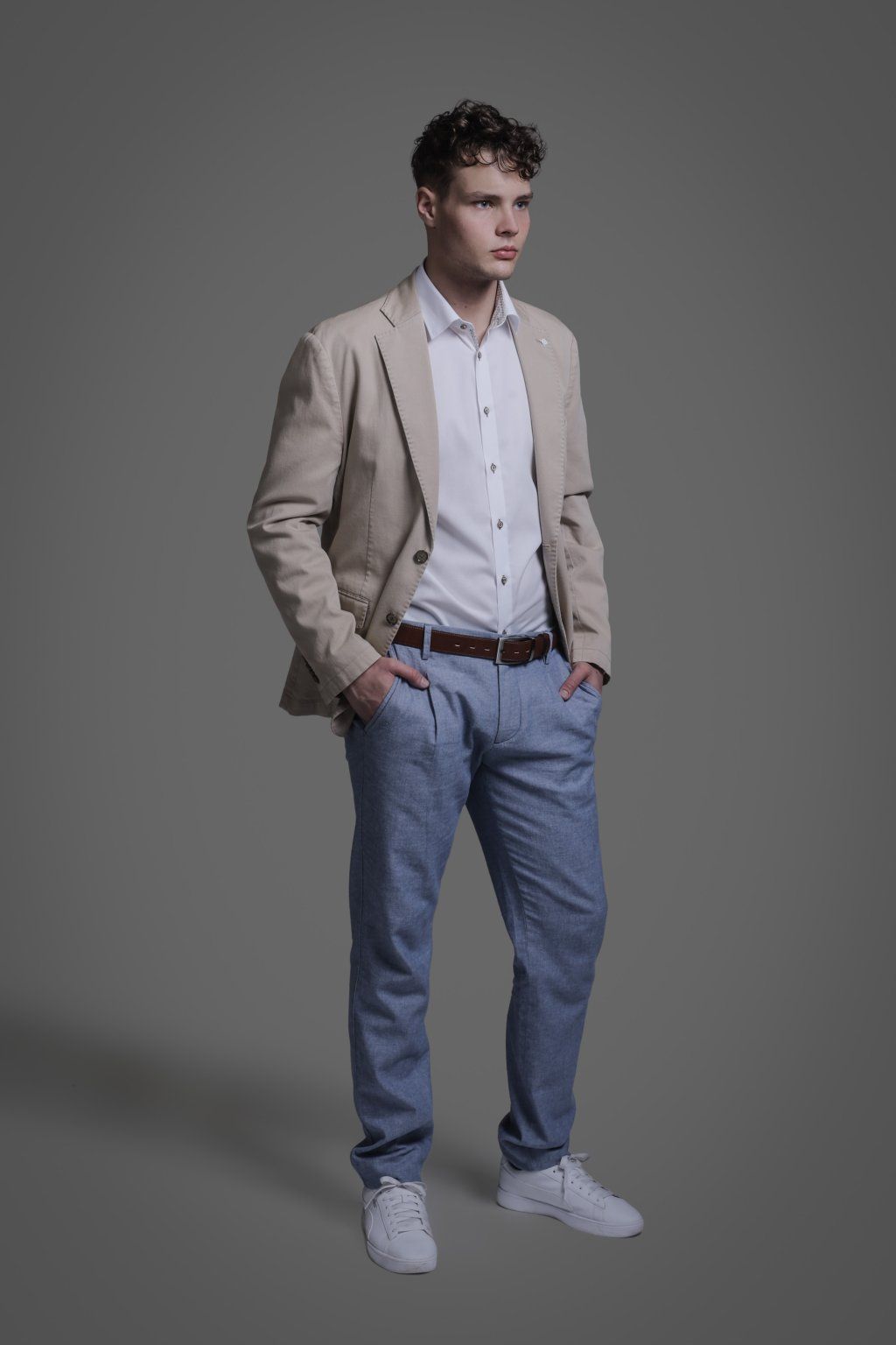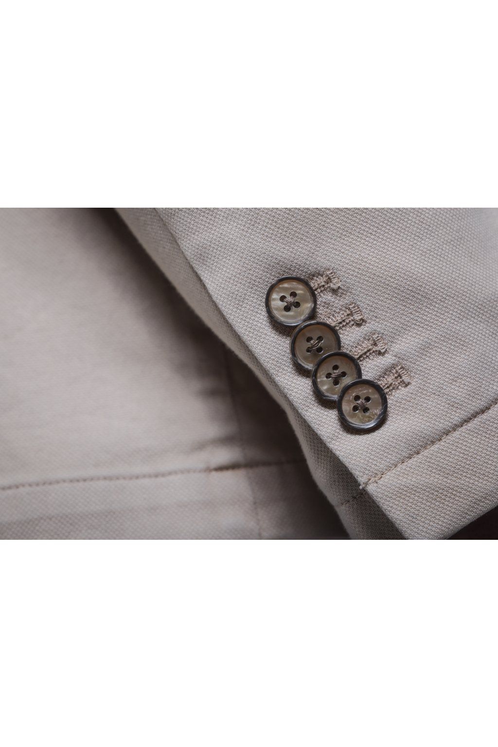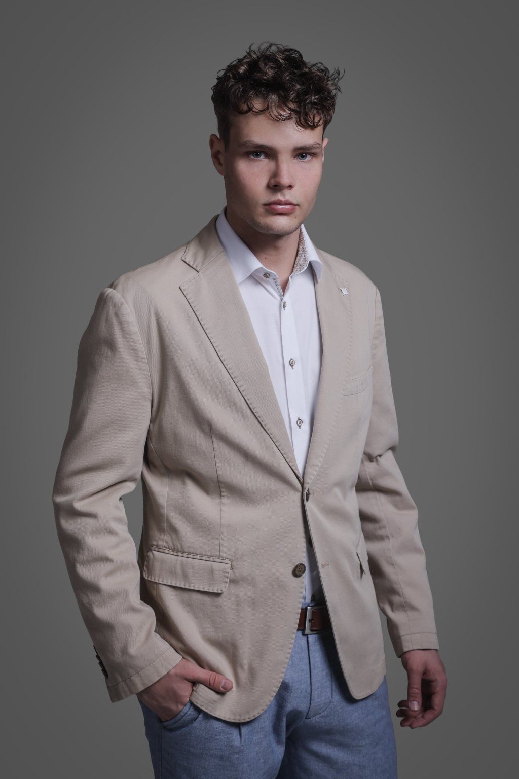 Jarní bavlněné sako v béžové barvě s kapsami. Má dva knoflíky, dva praktické rozparky a je ušito ve volnějším střihu, který je velmi příjemný při nošení.