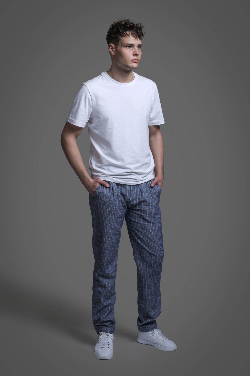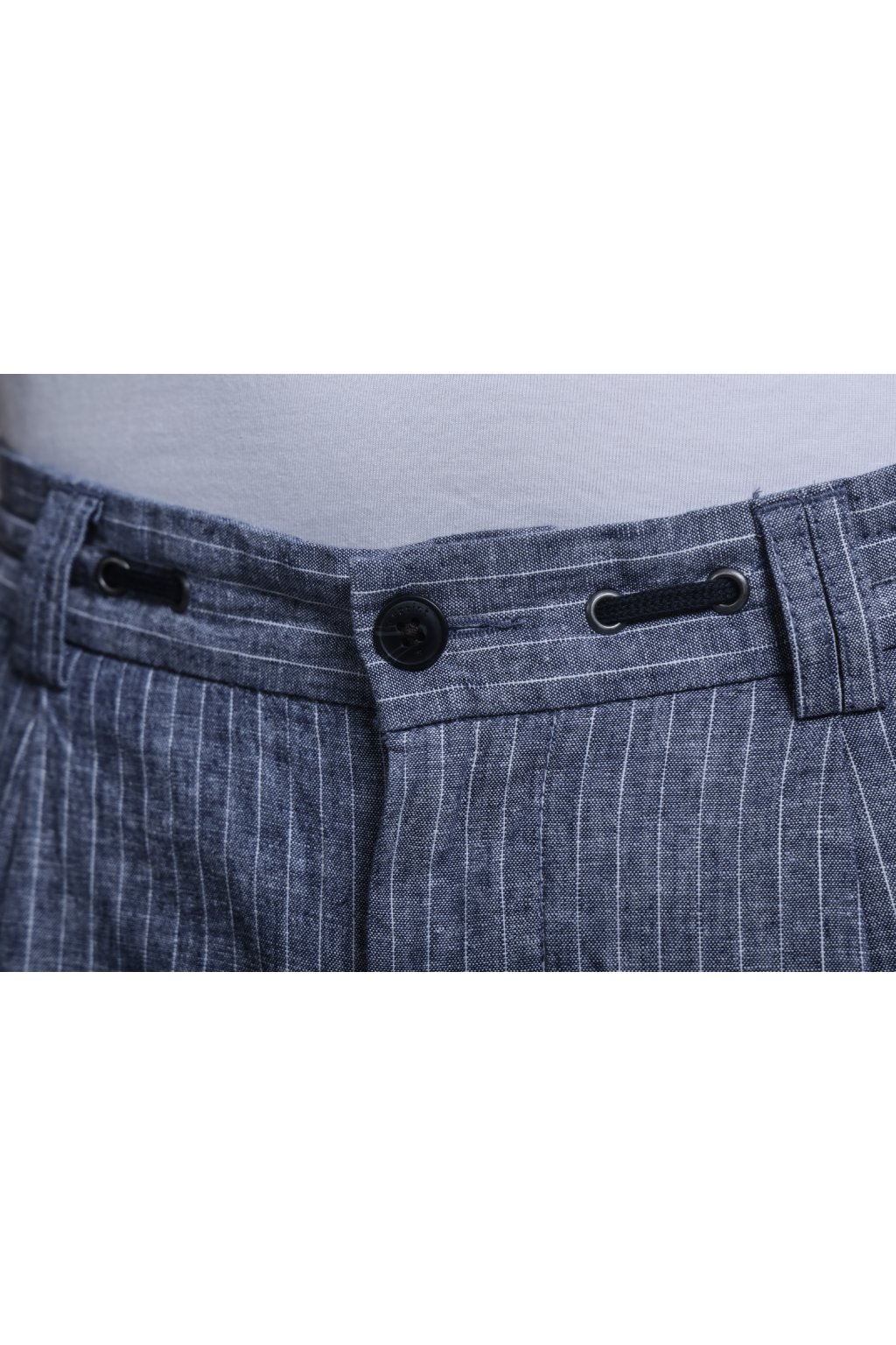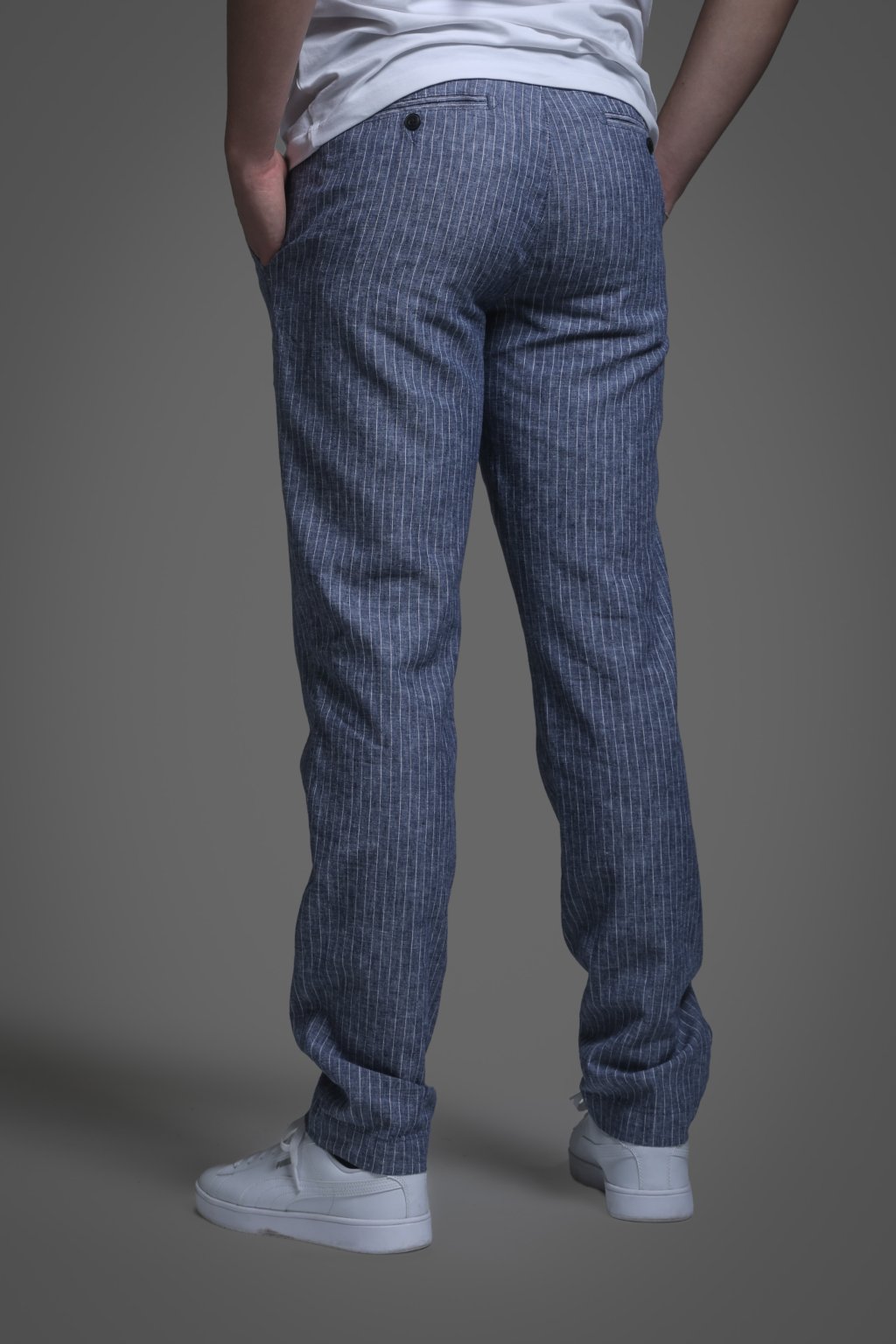 Volnočasové lněné chinos kalhoty v modré barvě s proužkem a s klínovými kapsami na předním díle a výpustkovými kapsami na zadním díle. Díky podílu lnu jsou lehké, prodyšné a velmi pohodlné, ideální pro letní dny. Skvěle se hodí do práce i pro volný čas.