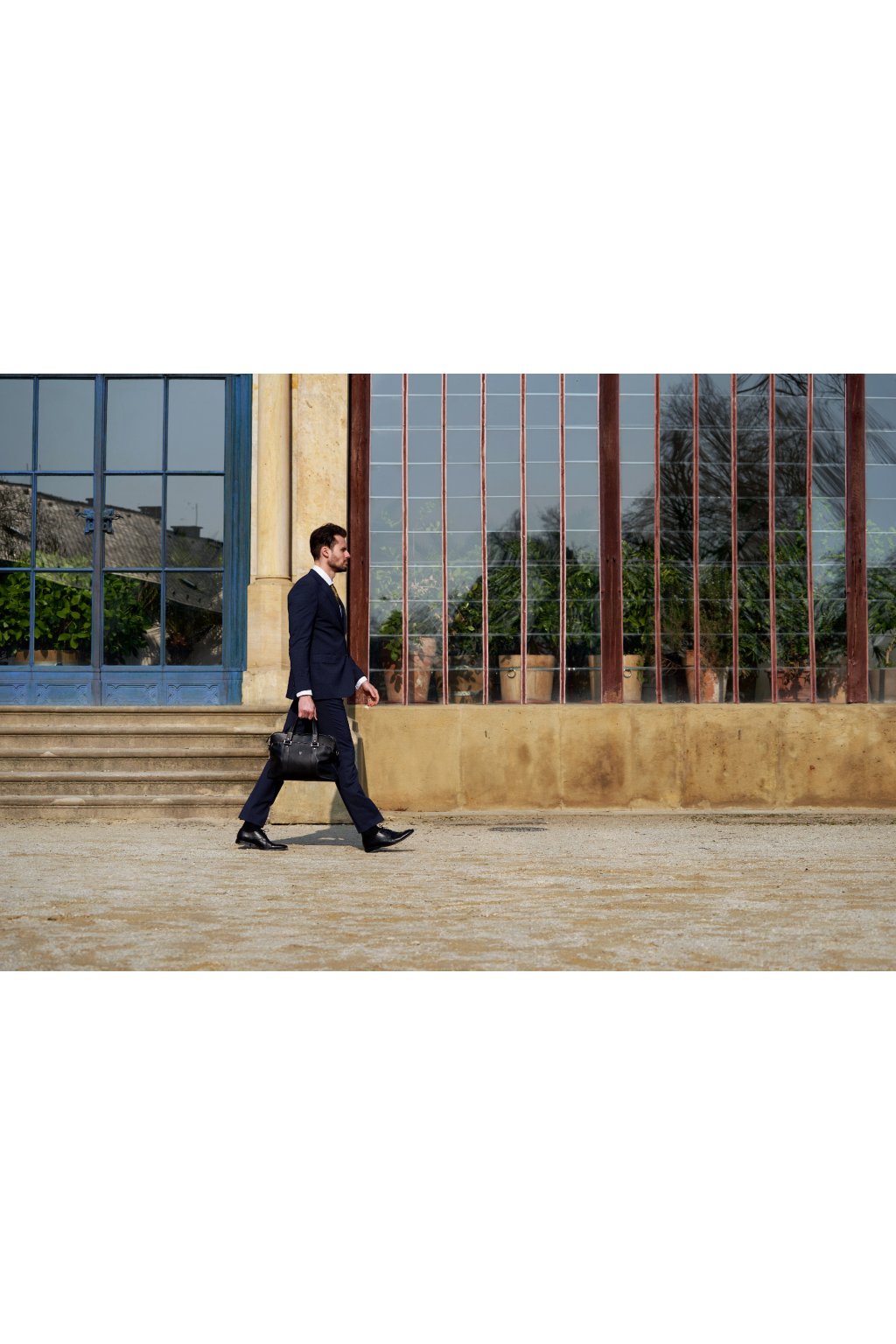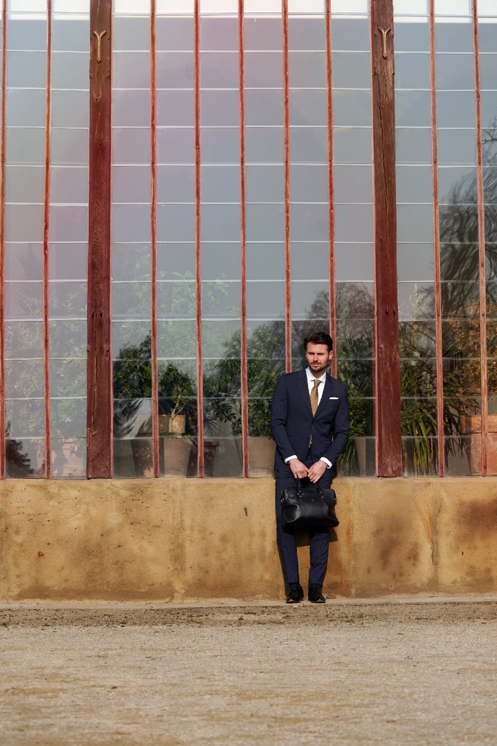 Tmavě modrý oblek s jemnou strukturou z kolekce Koutný Green. Při výrobě vrchového materiálu bylo přihlédnuto k ochraně životního prostředí. Oblek je zhotoven ve vyštíhleném střihu. Sako se zapíná na dva knoflíky. Zadní díl má dva rozparky. Kalhoty mají úzký střih.