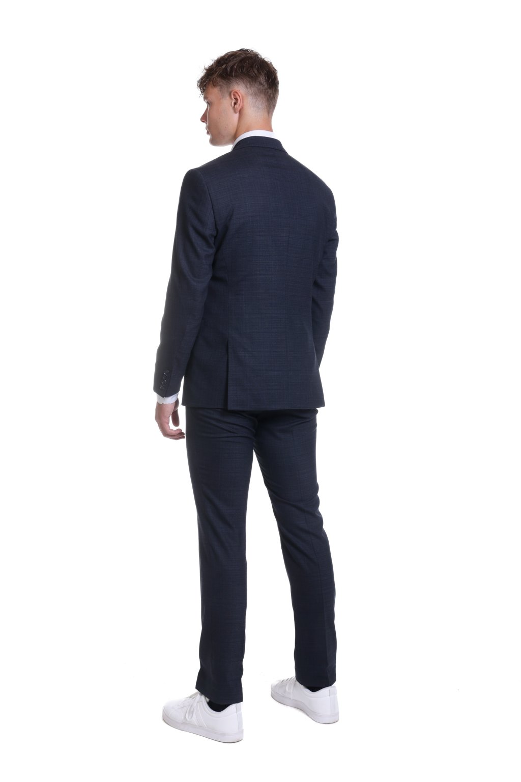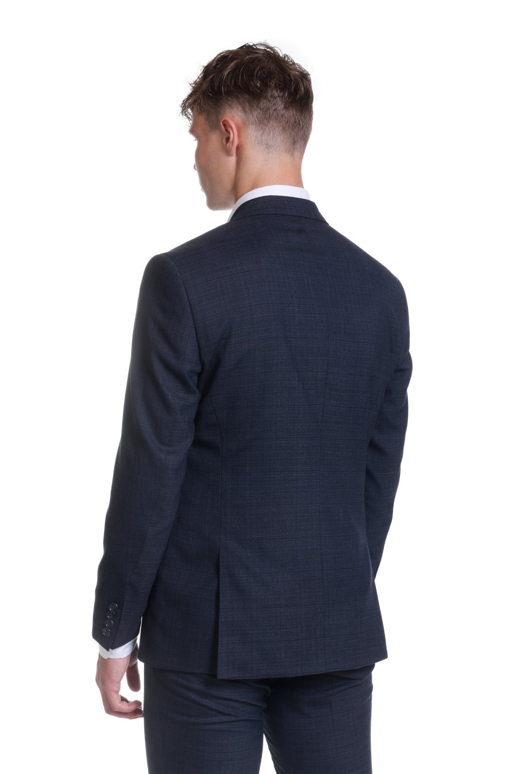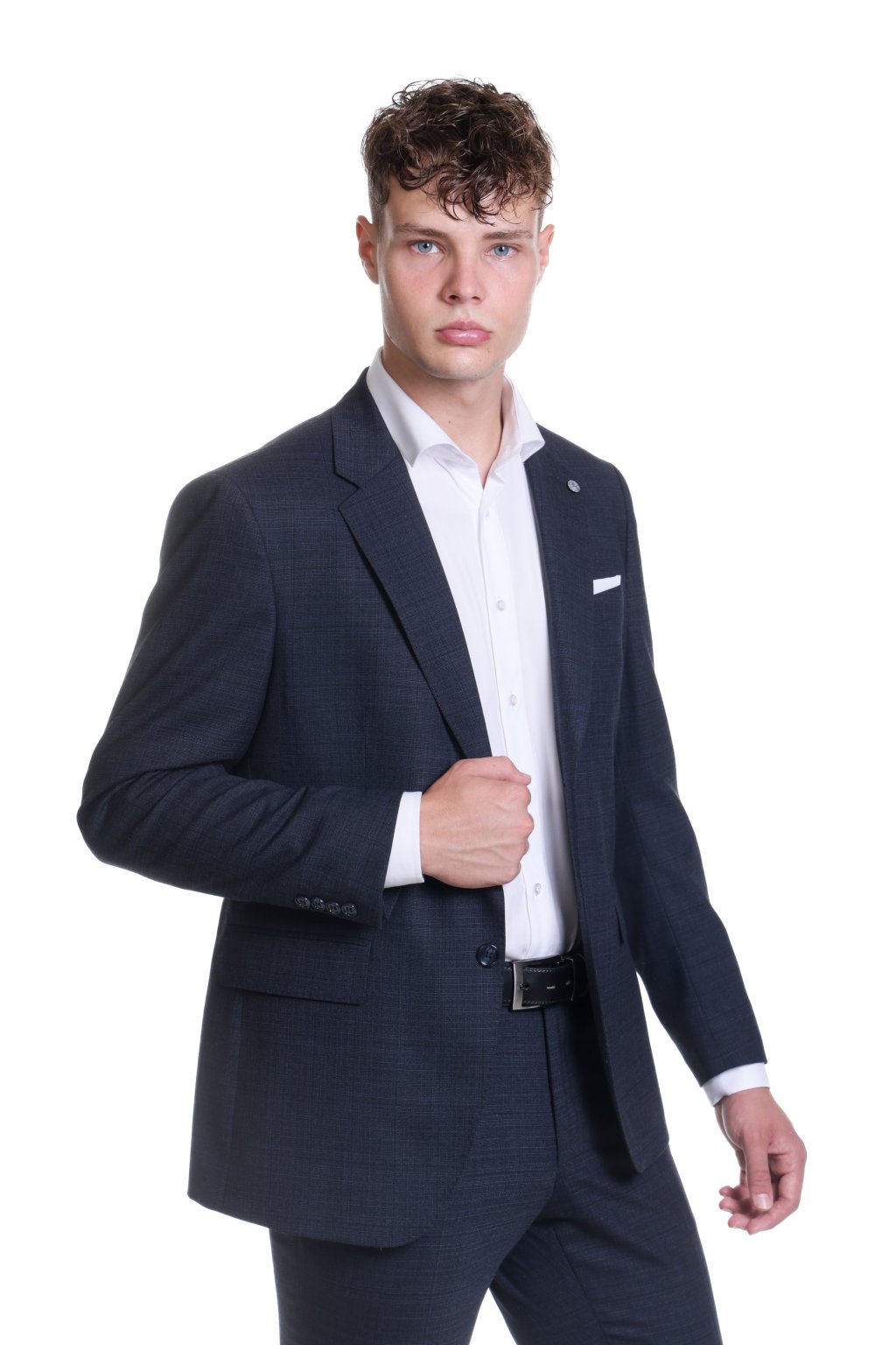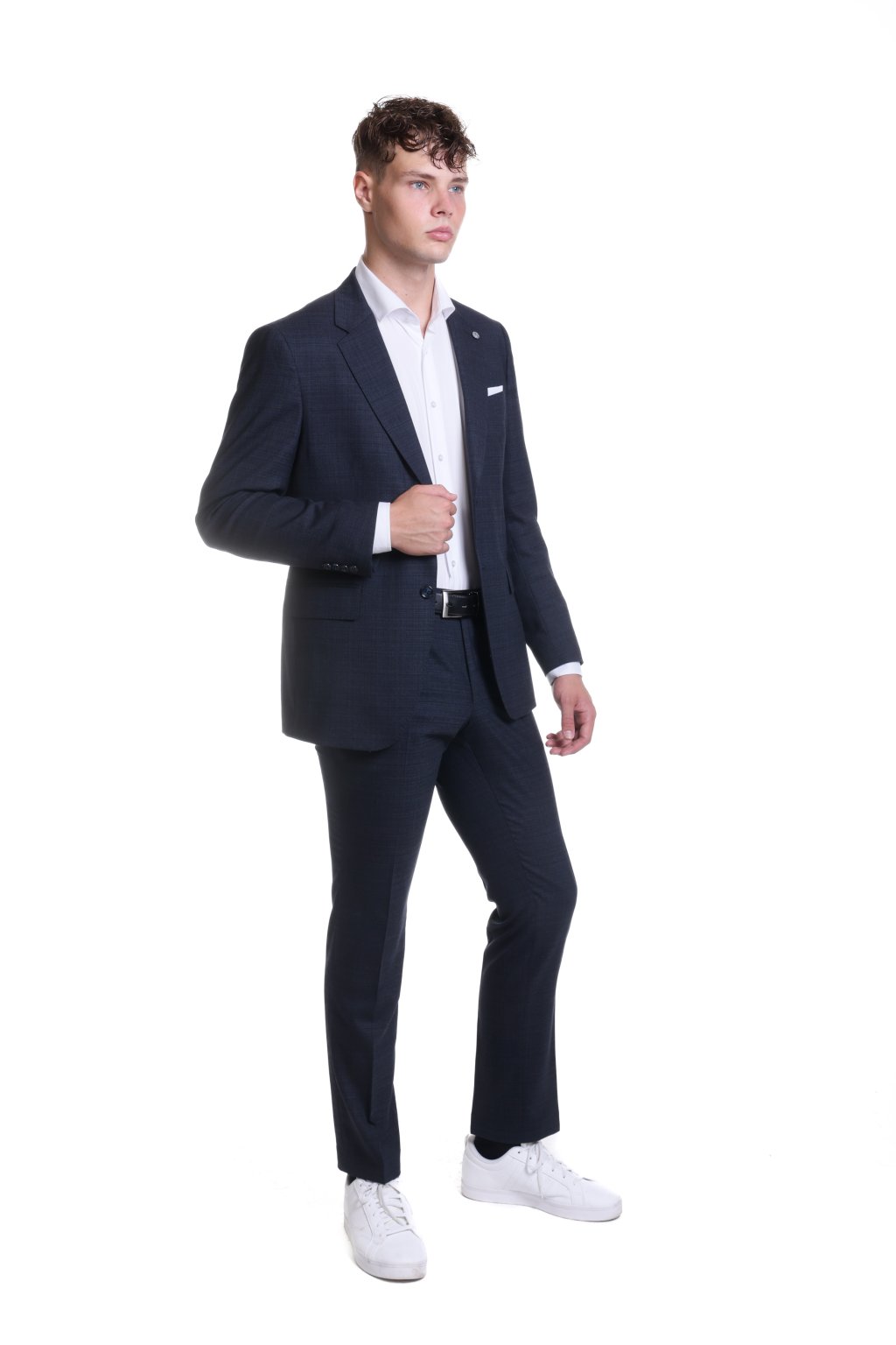 Modrošedý oblek s kontrastním světlým drobným čtvercovým vzorem. Je vyroben ve vyštíhleném střihu s vyšším podílem vlny a zdoben ozdobným prošitím stehu AMF. Sako je dvouknoflíkové a dvourozparkové, což podtrhuje jeho moderní a elegantní vzhled.