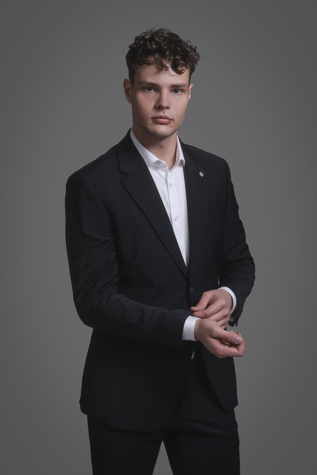 Černý oblek ve vyštíhleném střihu s ozdobným prošitím AMF. Sako je dvouknoflíkové a dvourozparkové, díky čemuž působí elegantně a nadčasově.
