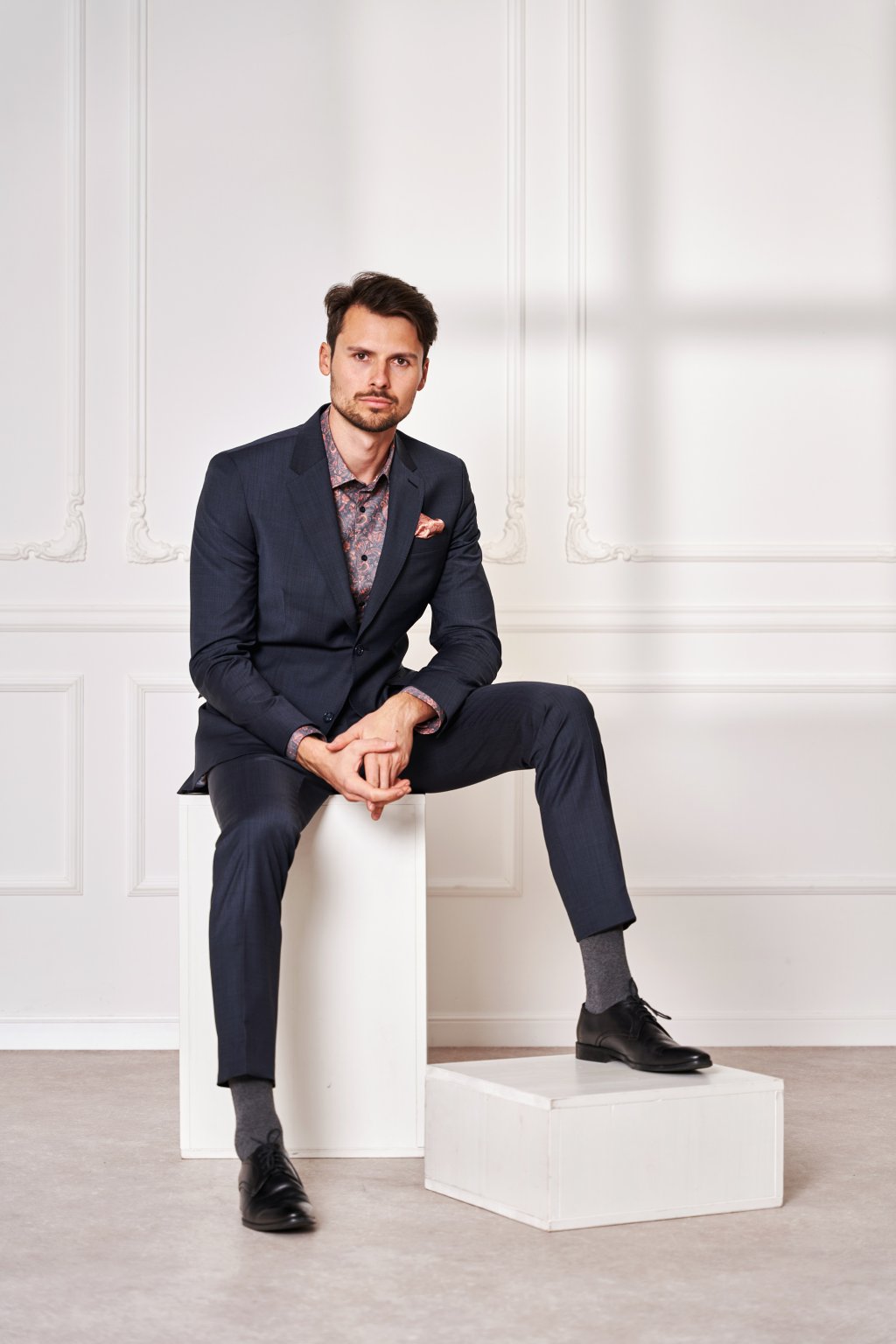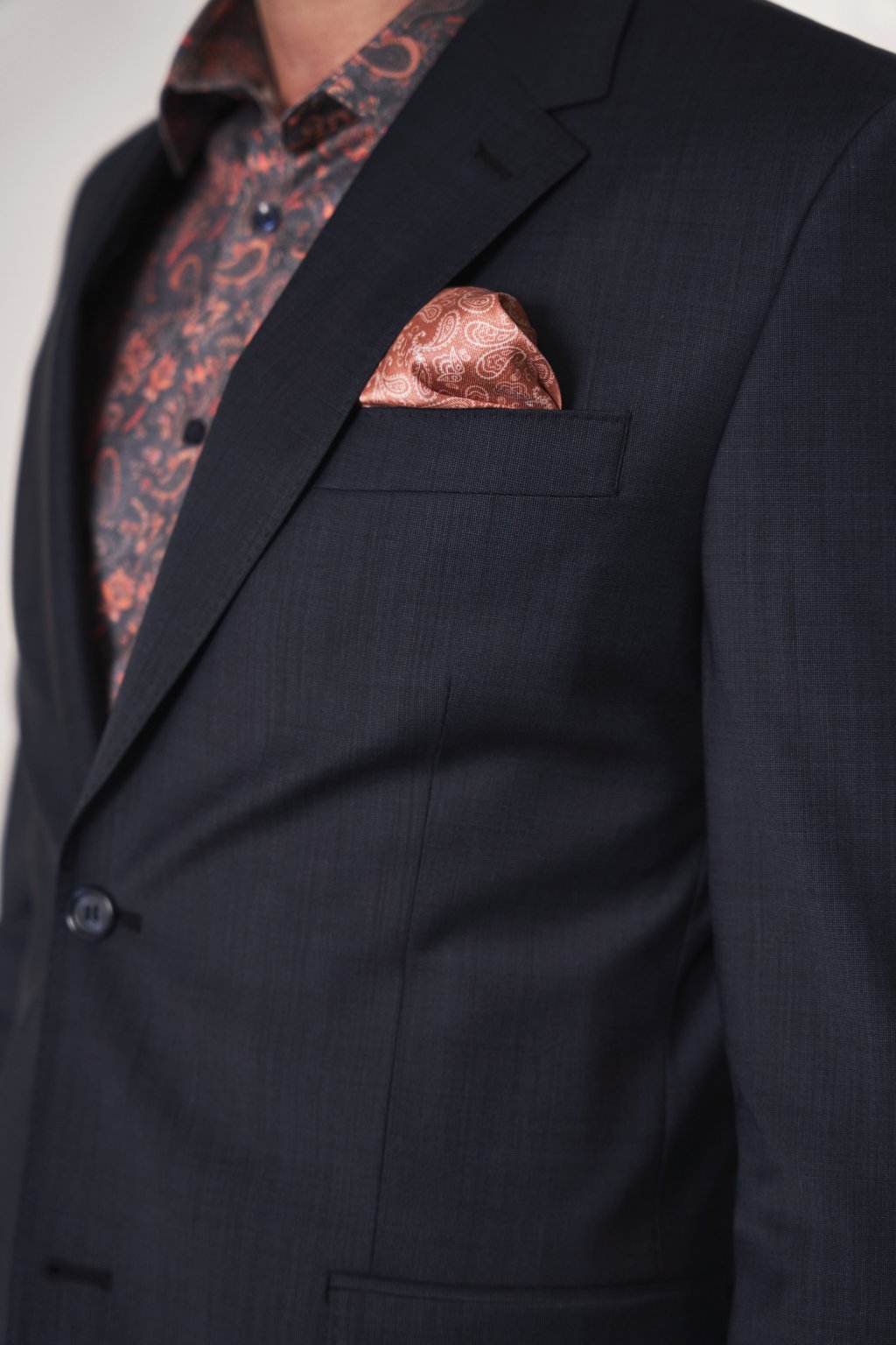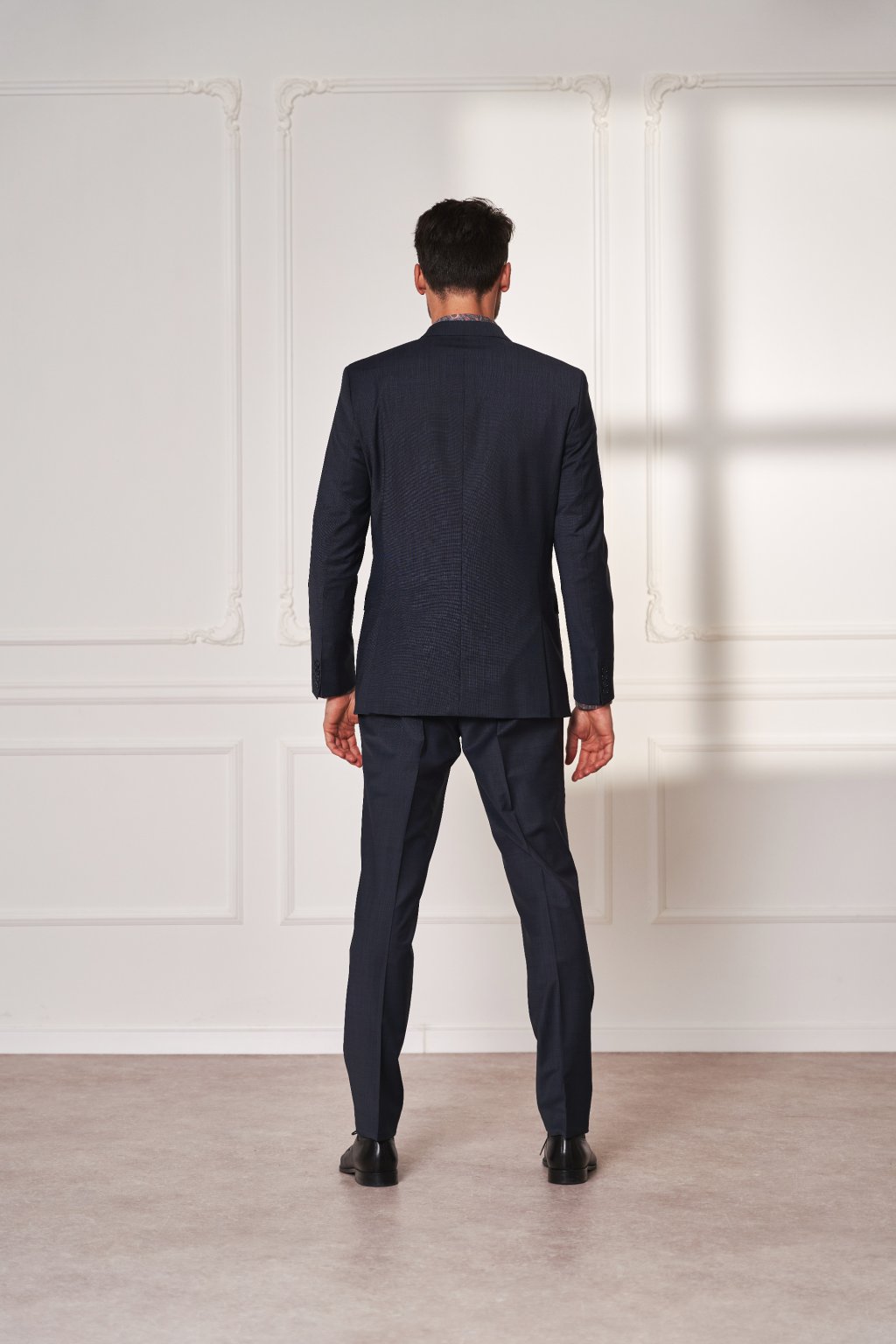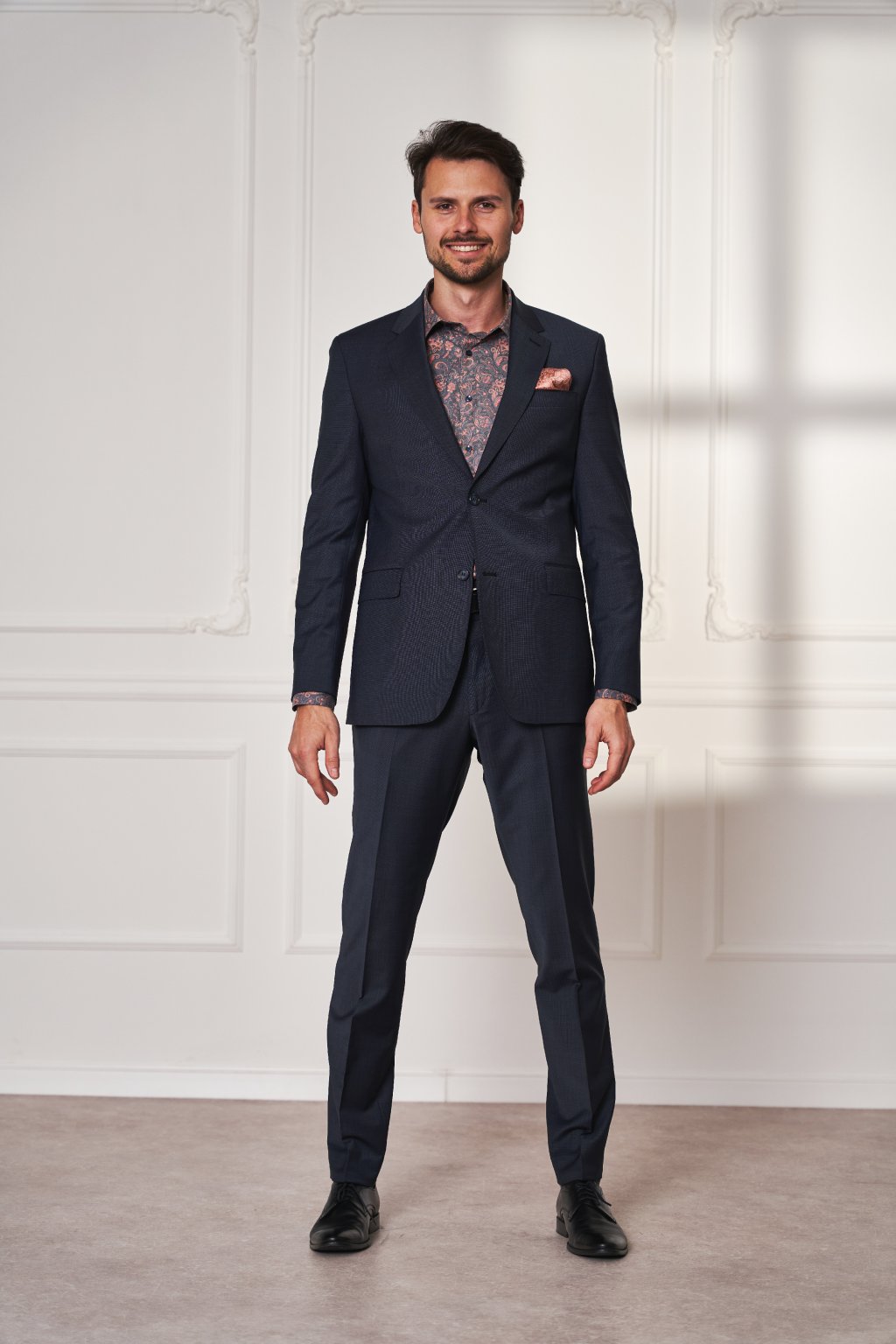 Elegantní tmavě modrý oblek s podílem vlny, který je zhotoven ve volnějším regular střihu. Sako tohoto obleku je dvoukonflíkové, dvourozparkové, s klopami o šířce 8 cm a zdobeným stehem AMF, který dodává vzhledu luxus.