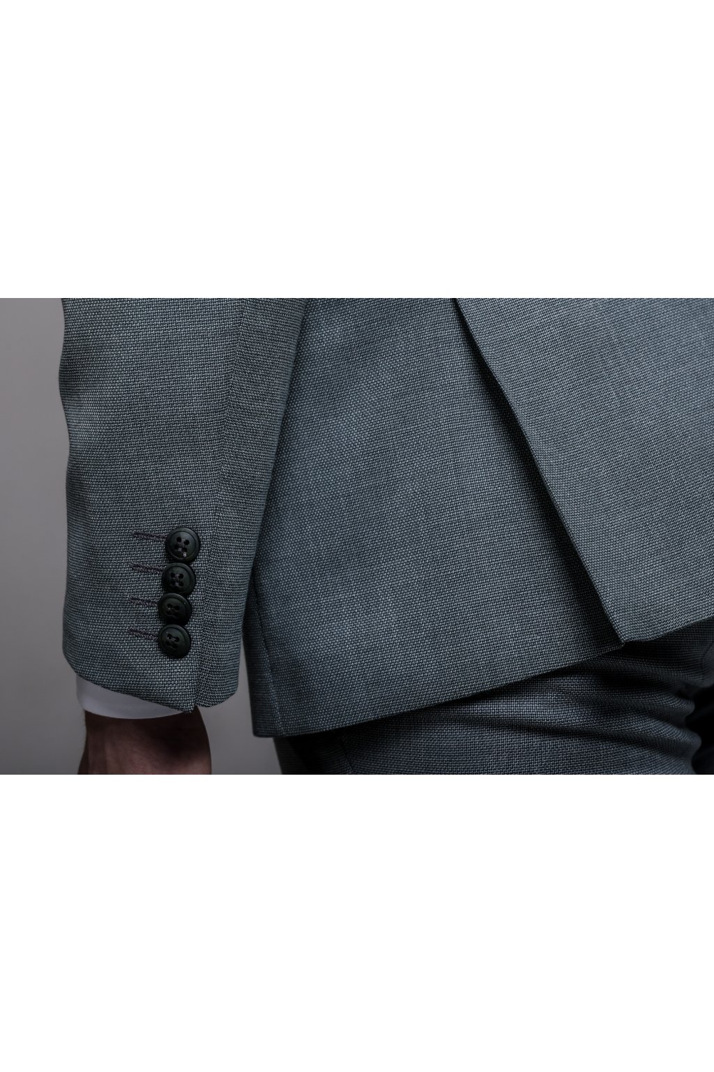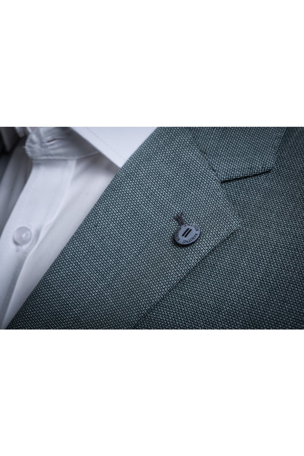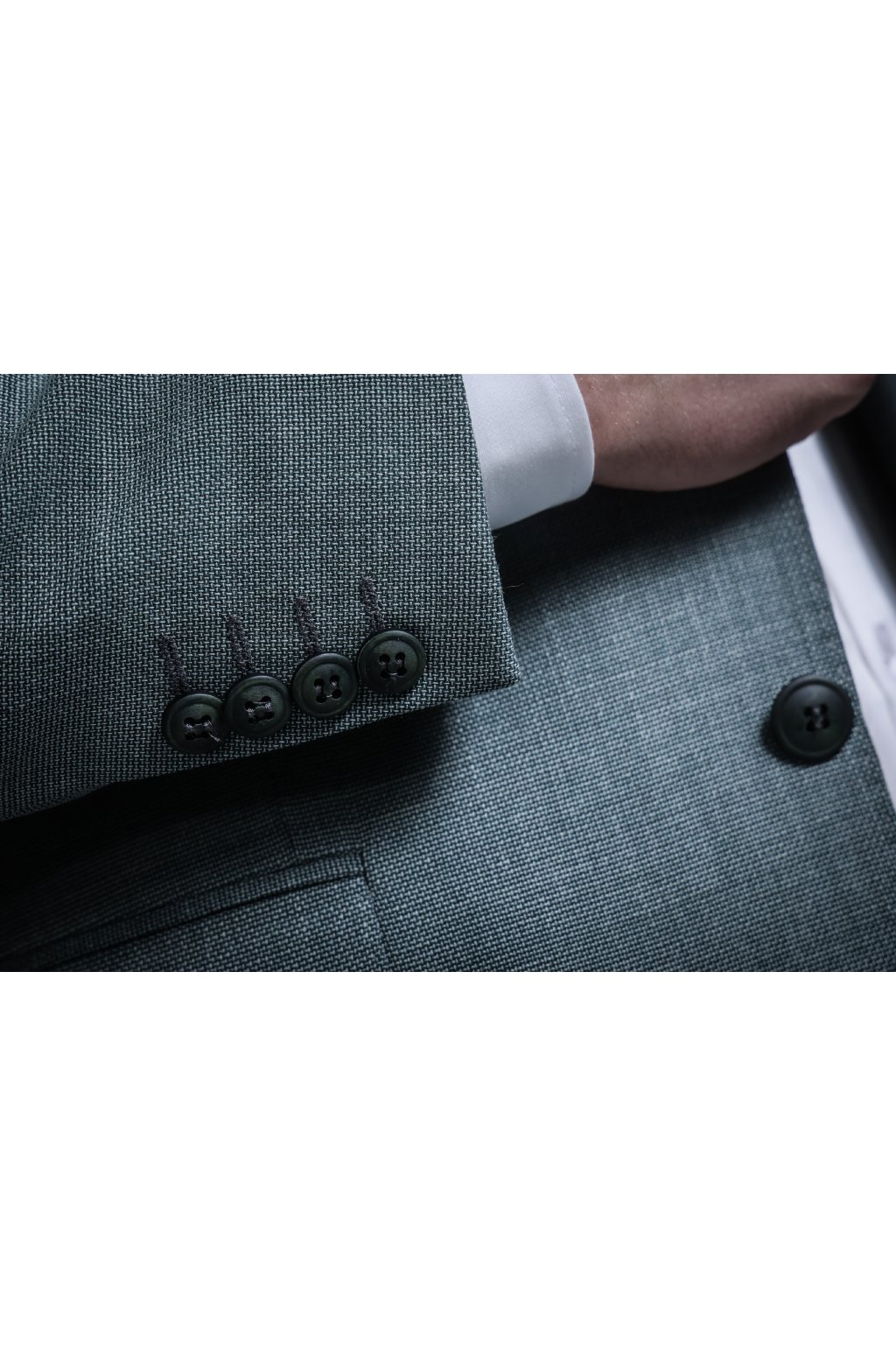 Elegantní světle zelený oblek s jemnou strukturou ve vyštíhleném střihu je ideální volbou pokud se chystáte na svatbu. Sako tohoto obleku je dvoukonflíkové, dvourozparkové, klopy mají šířku 8cm a ozdobný steh AMF. V rámci programu šití na míru je možné si nechat došít k obleku i vestu.