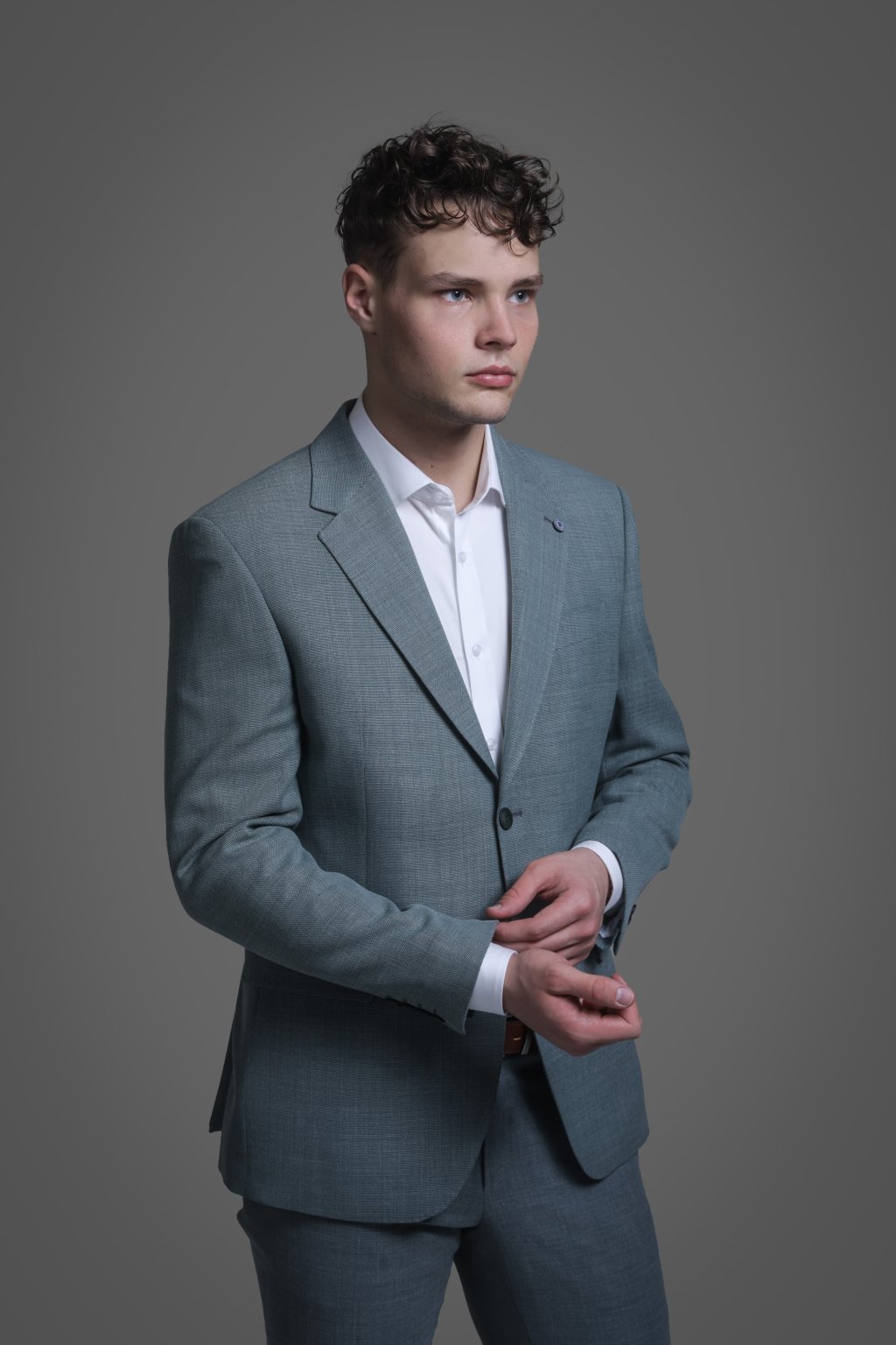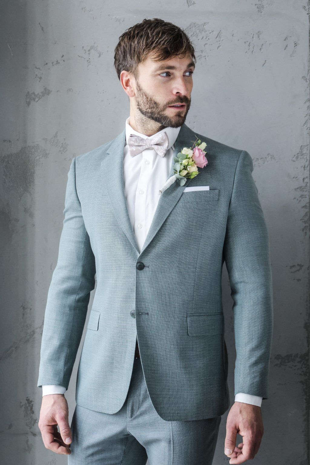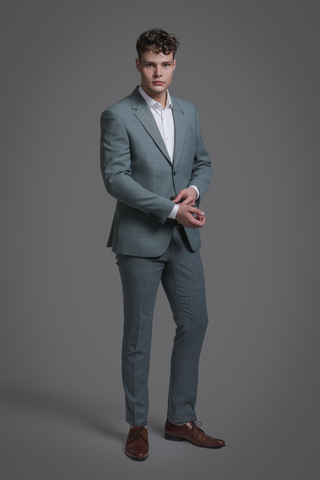 Elegantní světle zelený oblek s jemnou strukturou ve vyštíhleném střihu je ideální volbou pokud se chystáte na svatbu. Sako tohoto obleku je dvoukonflíkové, dvourozparkové, klopy mají šířku 8cm a ozdobný steh AMF. V rámci programu šití na míru je možné si nechat došít k obleku i vestu.
