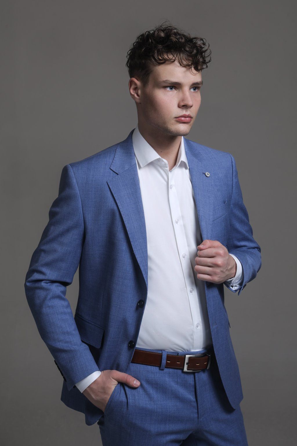Elegantní světle modrý oblek ve vyštíhleném střihu je ideální volbou pokud se chystáte na svatbu. Sako tohoto obleku je dvoukonflíkové, dvourozparkové, klopy mají šířku 8cm a ozdobný steh AMF. K obleku je možné dokoupit i samostatně vestu s artiklem 14D005/10 50.