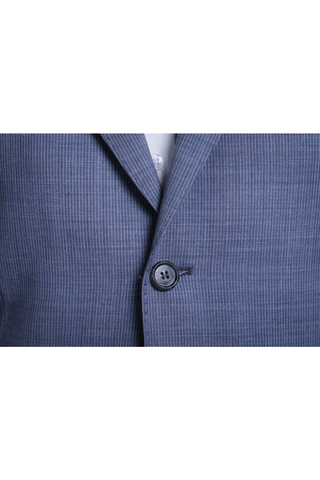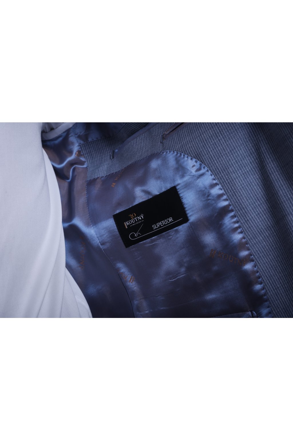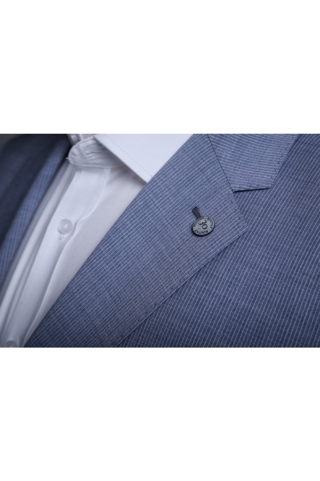 Elegantní světle modrý oblek s jemným proužkem ve vyštíhleném střihu. Sako tohoto obleku je dvoukonflíkové, dvourozparkové, klopy mají šířku 8cm a ozdobný steh AMF. V rámci programu šití na míru je možné si nechat došít k obleku i vestu.