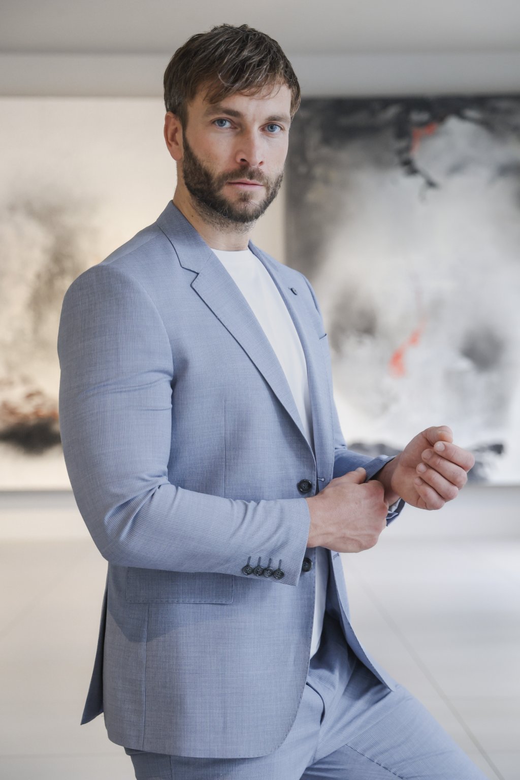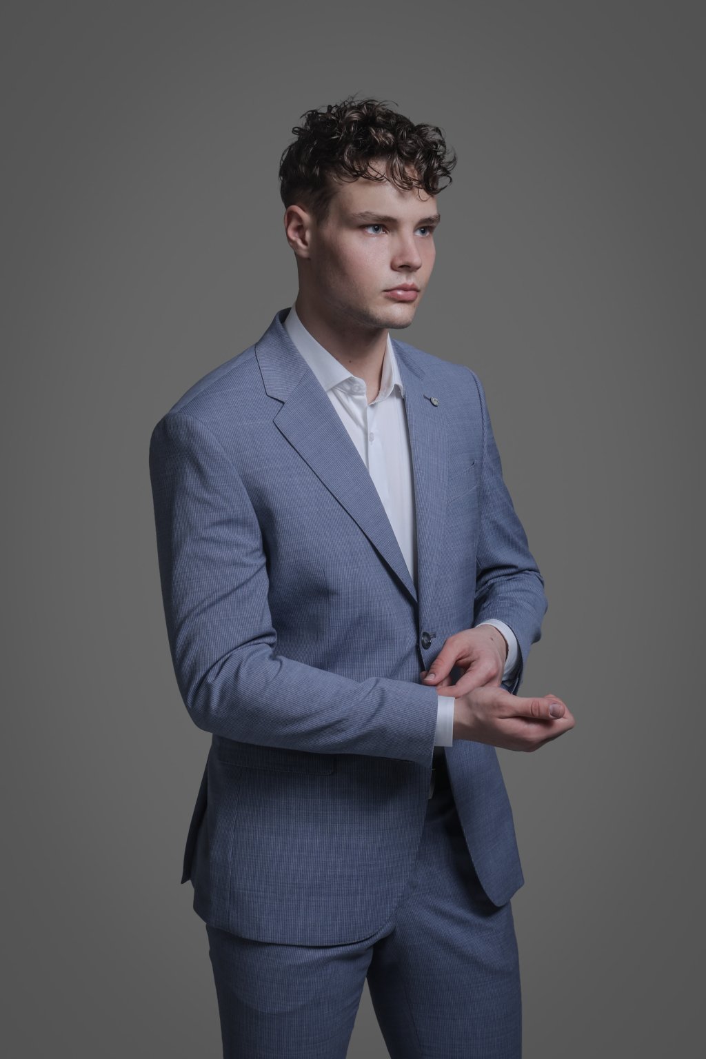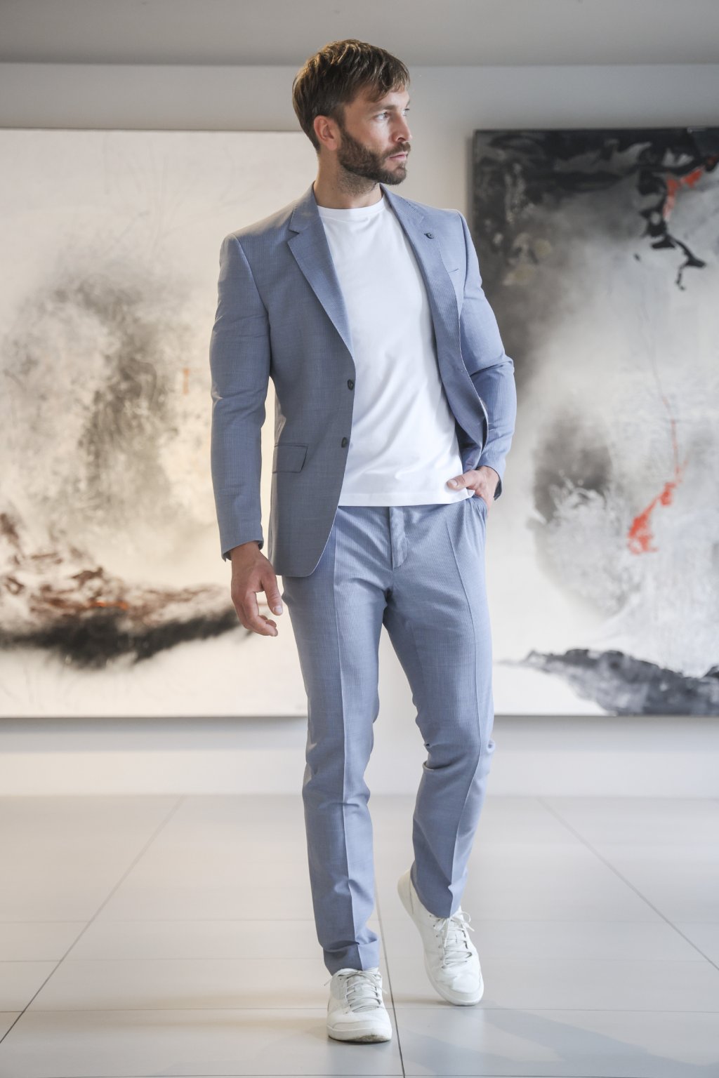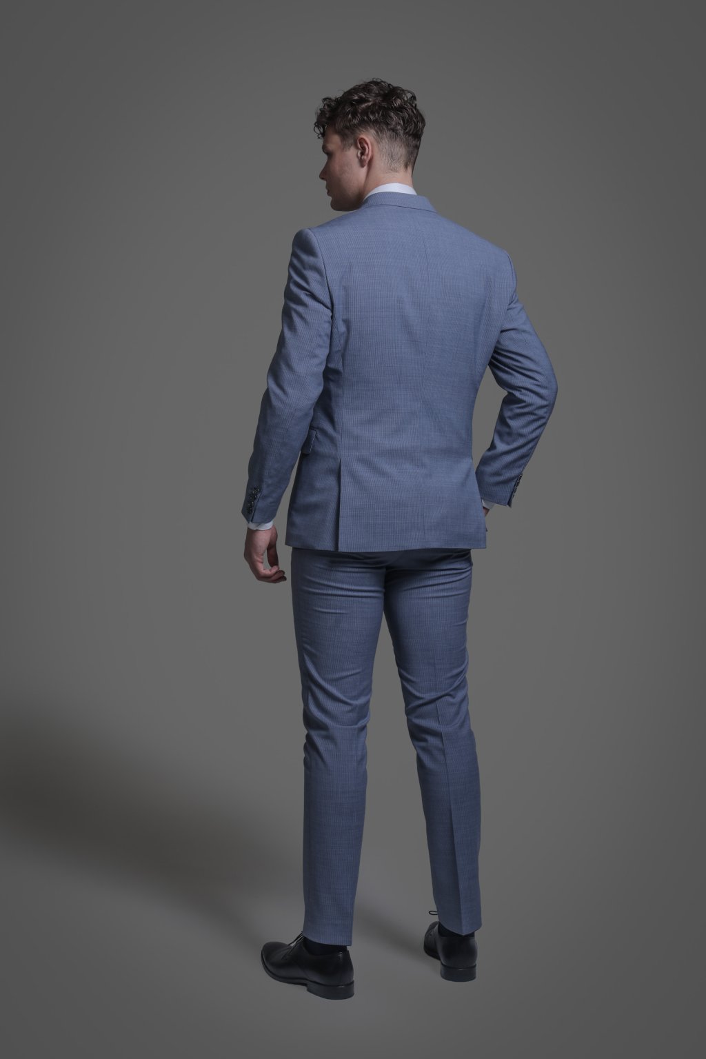 Elegantní světle modrý oblek s jemným proužkem ve vyštíhleném střihu. Sako tohoto obleku je dvoukonflíkové, dvourozparkové, klopy mají šířku 8cm a ozdobný steh AMF. V rámci programu šití na míru je možné si nechat došít k obleku i vestu.