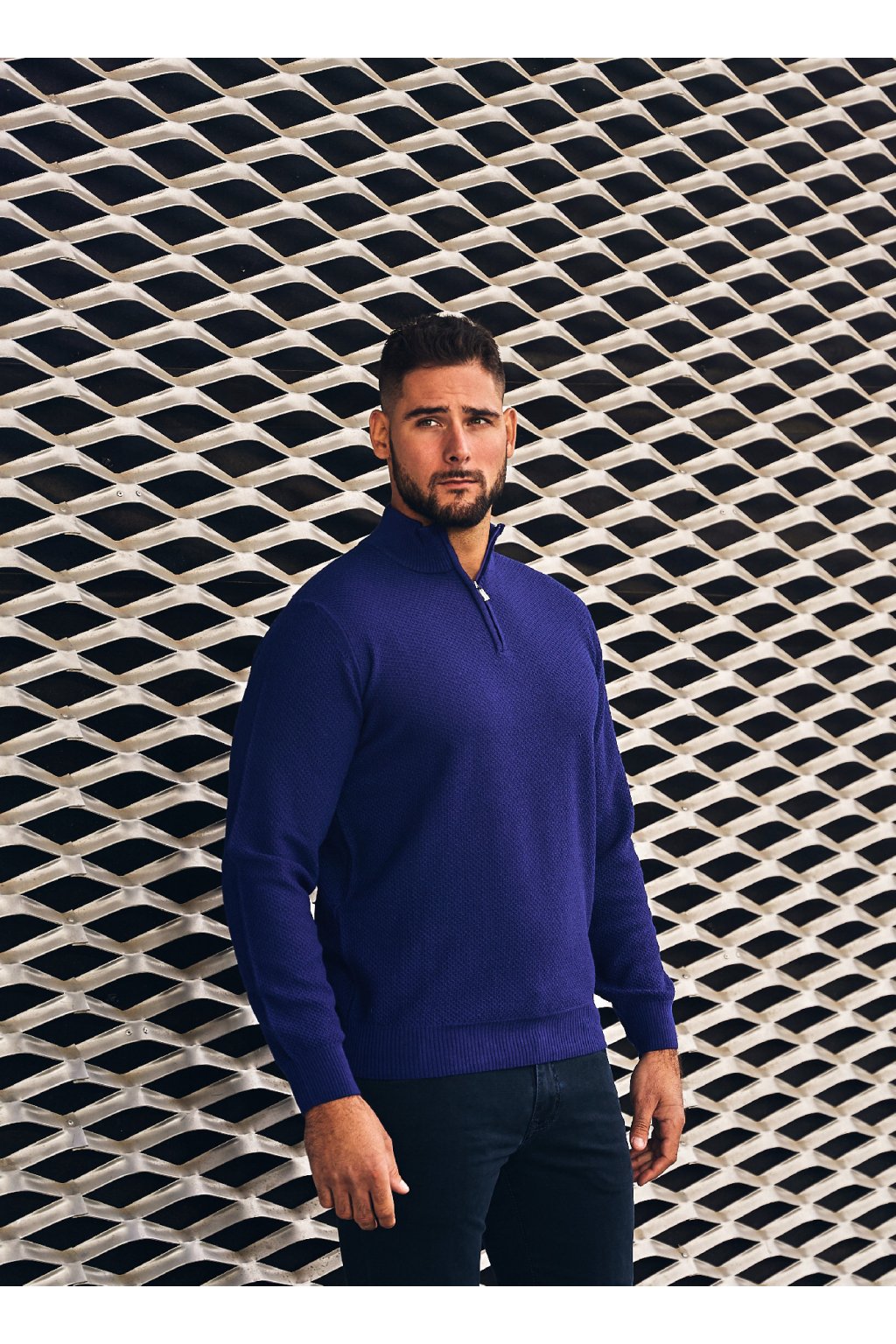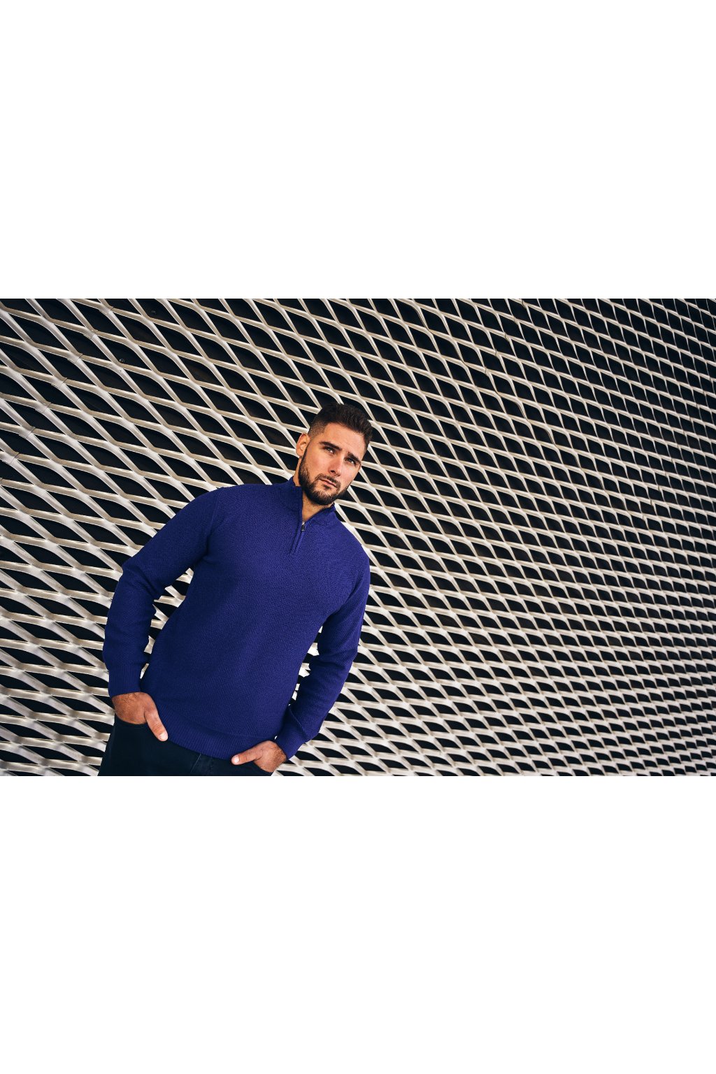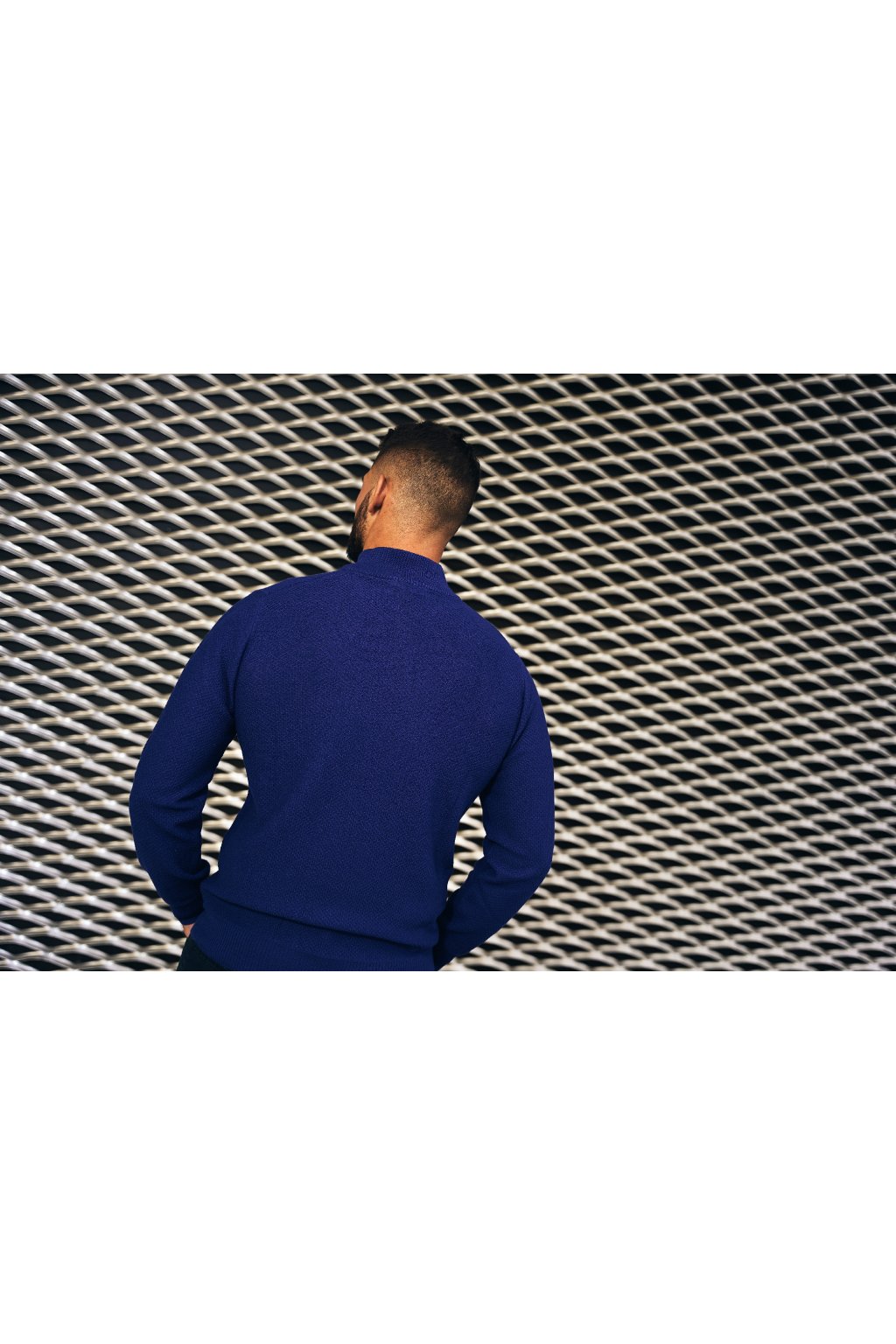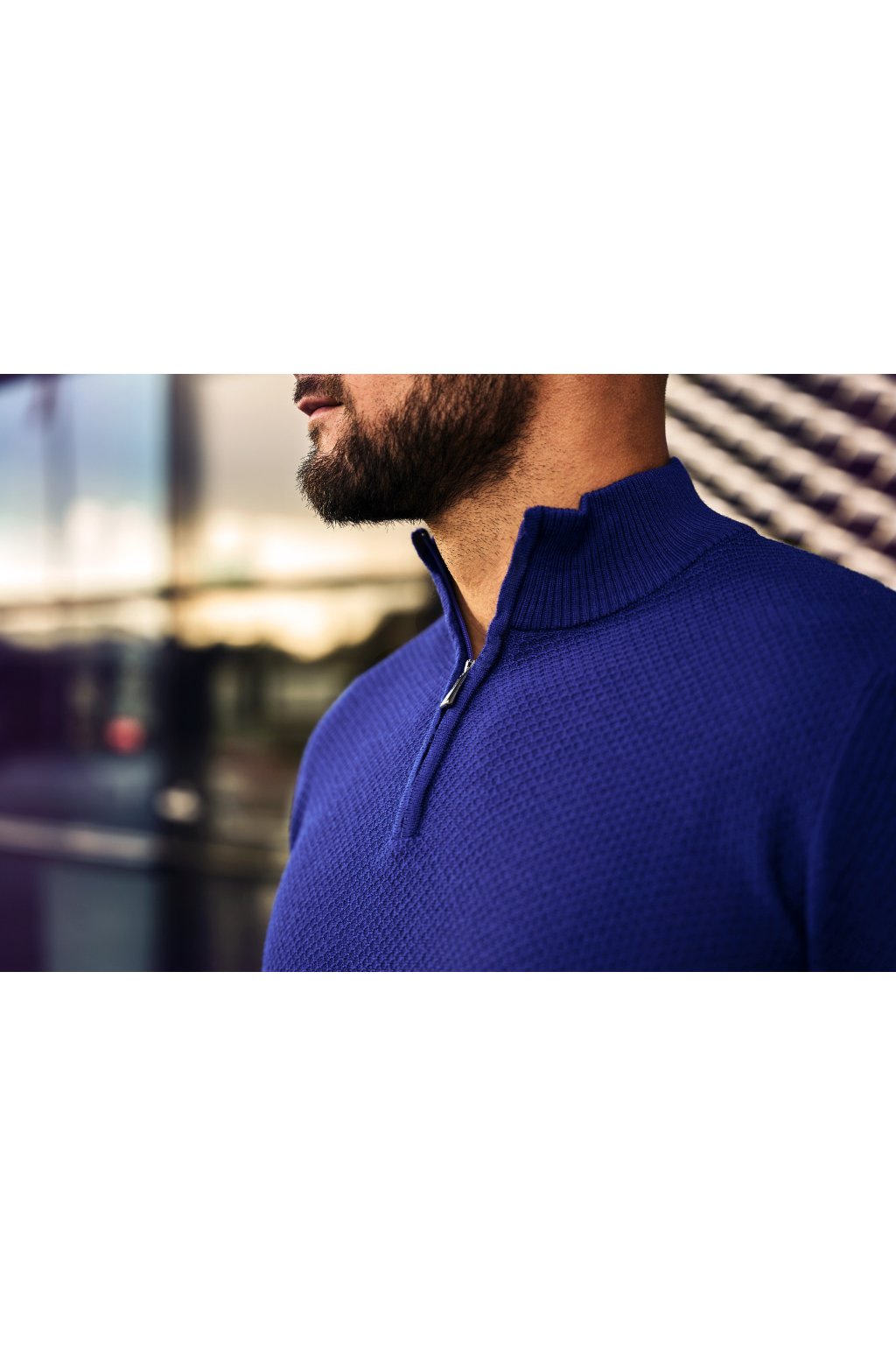 Pánský modrý svetr se stojáčkem. Stojáček na zip, ukončení rukávů a těla je z žebrovaného úpletu. Tento příjemný svetr je vyrobený z merino vlny a je vhodný pro každodenní nošení. Můžete kombinovat k volnočasovému outfitu.